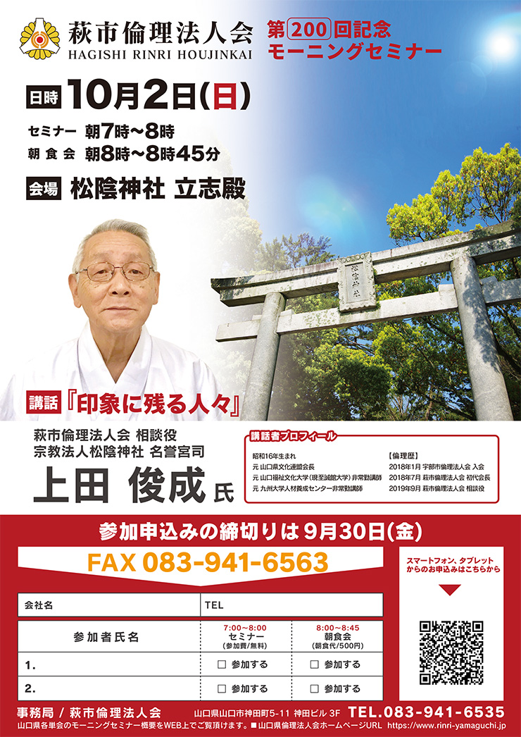 宗教法人松陰神社 名誉宮司  上田 俊成氏