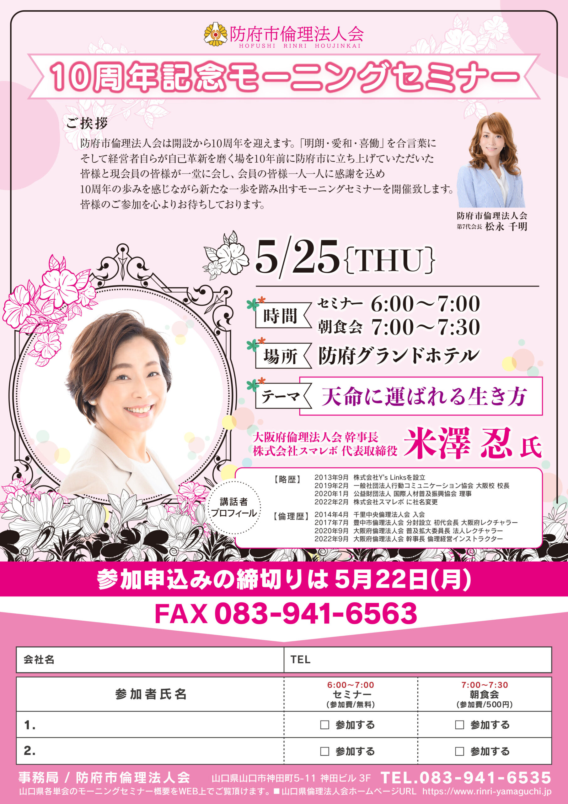 防府市倫理法人会 10周年記念モーニングセミナー 講話 大阪府倫理法人会幹事長 株式会社スマレボ代表取締役 米澤 忍氏 テーマ 「天命に運ばれる生き方」 日時 2023年5月25日(水)6:00~7:00 会場 防府グランドホテル