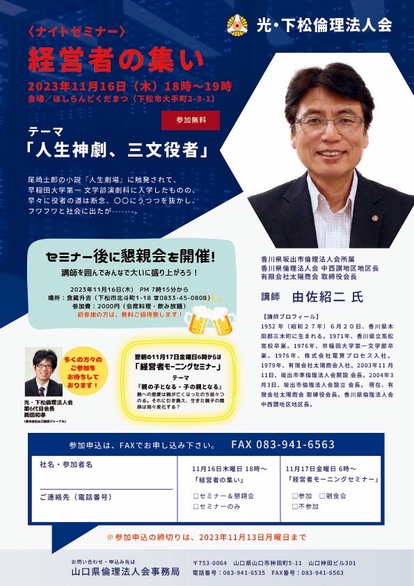 2023年11月16日(木) <経営者の集い> 講師:(一社)倫理研究所 法人レクチャラー 由佐 紹二 氏 テーマ:人生神劇 三文役者