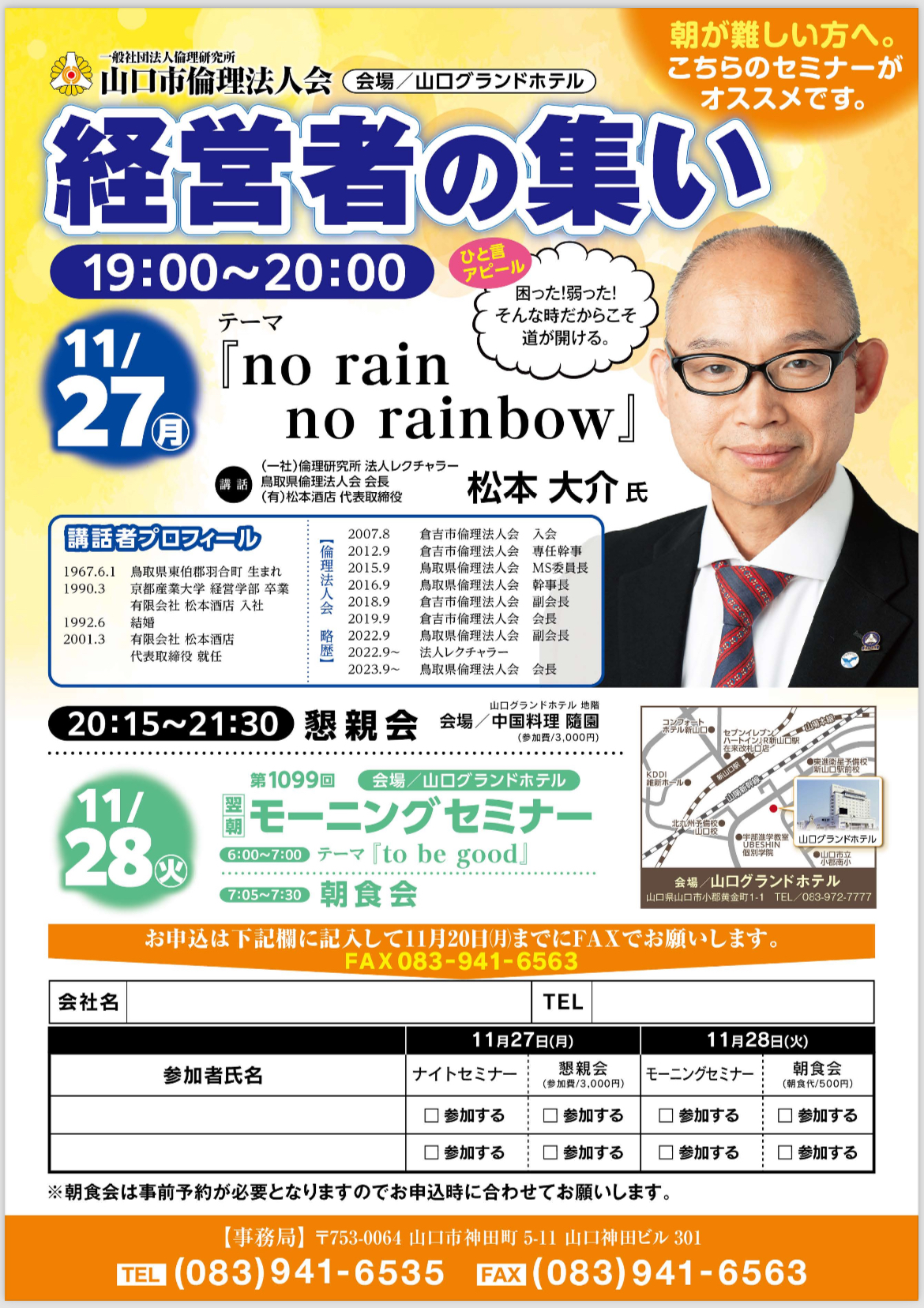 2023年11月27日(月) 【経営者の集い】一般社団法人倫理研究所 法人レクチャラー 鳥取県倫理法人会 会長 松本 大介 氏 テーマ:「 no rain no rainbow 」