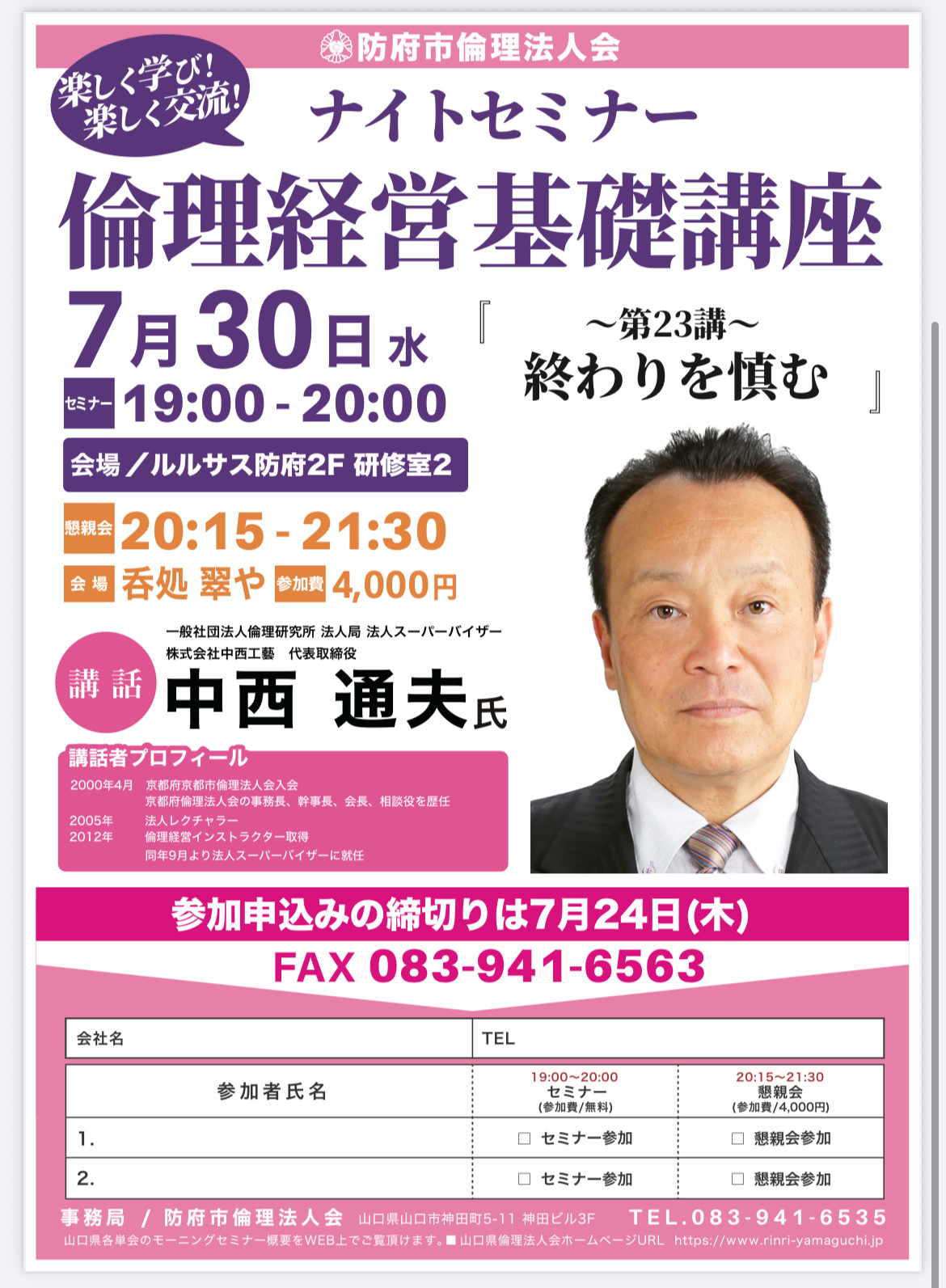 ナイトセミナー♪ 倫理経営基礎講座 講話 (一社)倫理研究所 法人局 法人スーパーバイザー 株式会社中西工藝 代表取締役 中西通夫氏 テーマ 「~第23講~ 終わりを慎む」 日時 2025年7月30日(水)19:00~20:00 会場 ルルサス防府2F 研修室2