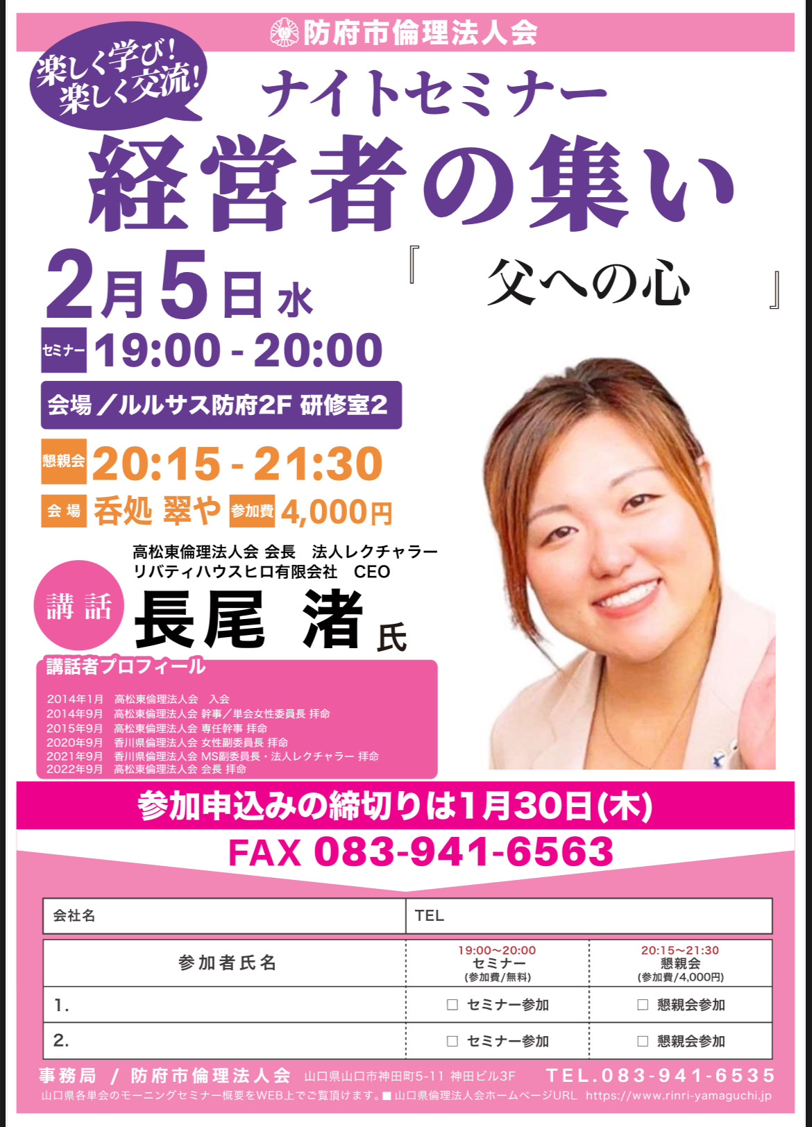 2025年2月5日(水) ナイトセミナー♪ 経営者の集い テーマ父への心 講師高松東倫理法人会 会長 法人レクチャラー リバティハウスヒロ有限会社 CEO 長尾 渚氏 会場 ルルサス防府2F 研修室2 時間 (参加希望の方は事務局までお申し出ください。) お問合せ山口県倫理法人会 事務局 TEL:083-941-6535 FAX:083-941-6563