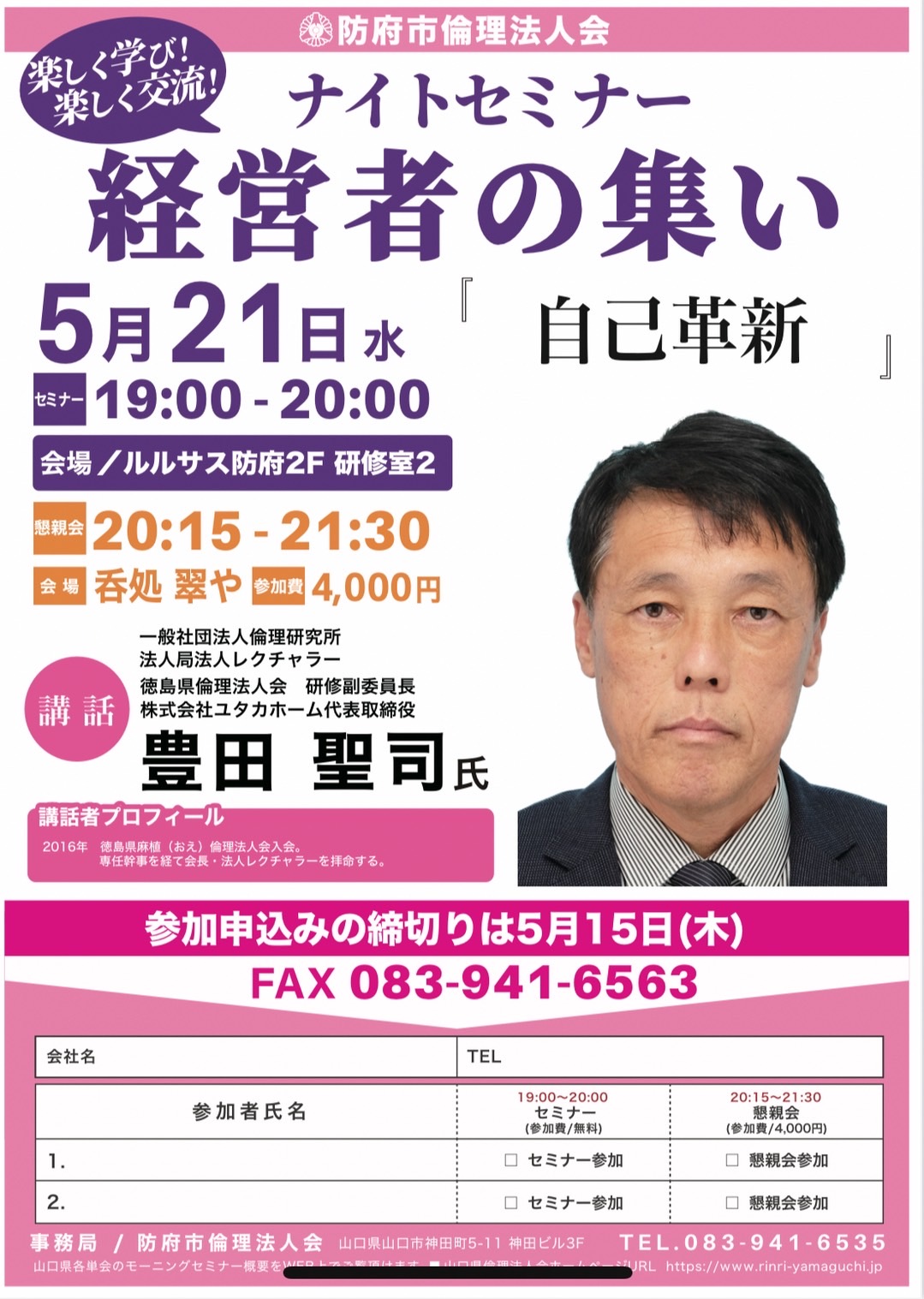 2025年4月28日(月) ナイトセミナー♪ 経営者の集い テーマ 講師 会場 時間 (参加希望の方は事務局までお申し出ください。) お問合せ山口県倫理法人会 事務局 TEL:083-941-6535 FAX:083-941-6563 講話 (一社)倫理研究所 法人局法人レクチャラー 徳島県倫理法人会 研修副委員長 株式会社ユタカホーム代表取締役 豊田聖司氏 テーマ 「自己革新」 日時 2025年5月21日(水)19:00~20:00 会場 ルルサス防府2F 研修室2