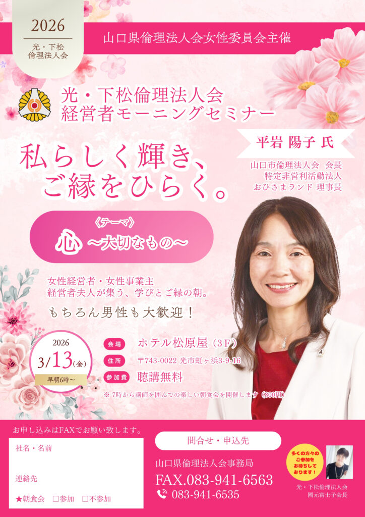 山口県女性委員会主催/光・下松倫理法人会特別MS 光下松倫理法人会 第732回経営者モーニングセミナーは 山口県女性委員会主催の光・下松倫理法人会特別モーニングセミナーです! 多くの方々のお越しをお待ちしております!