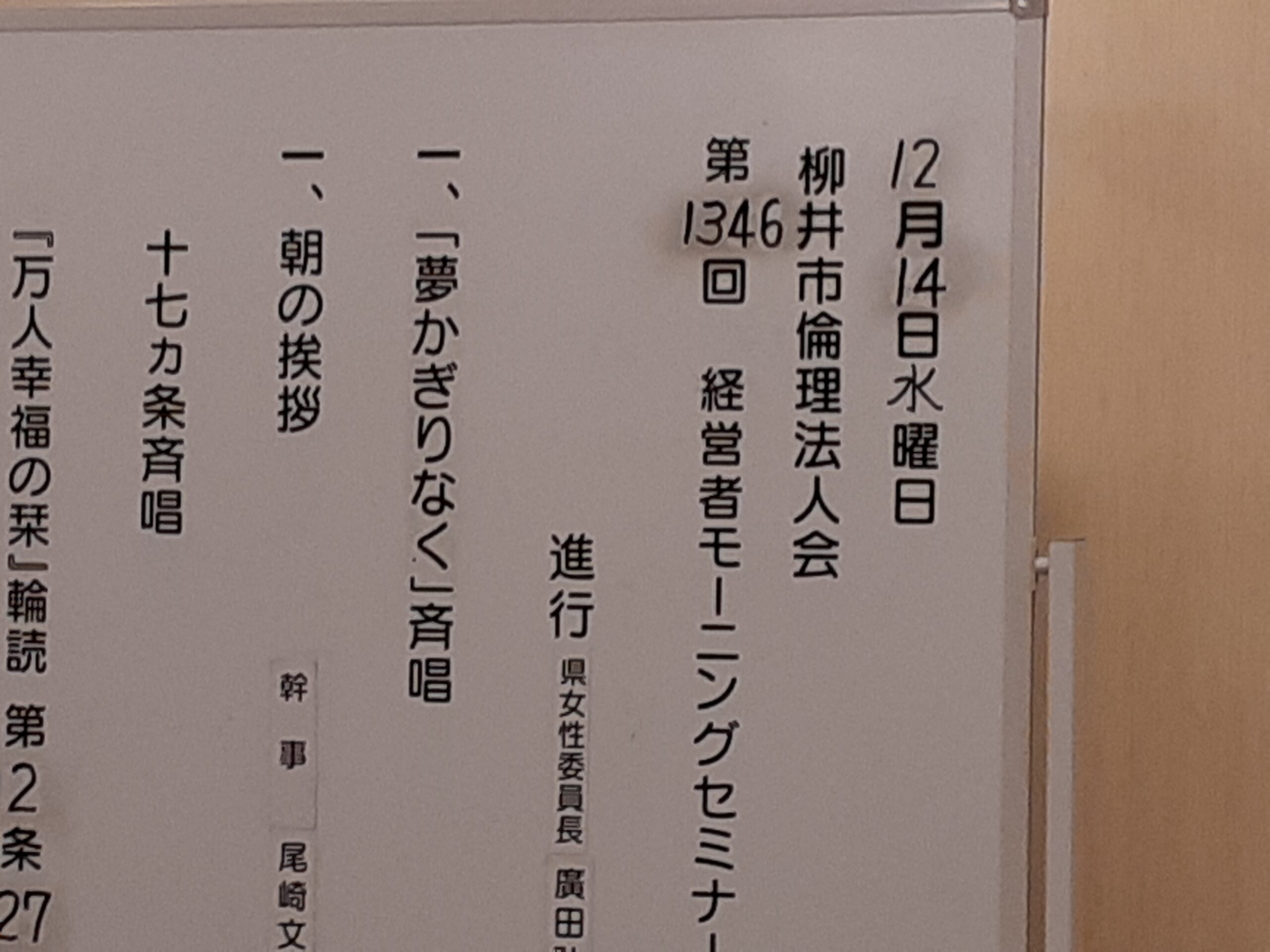 12/14の柳井市倫理法人会第1346回経営者モーニングセミナーは、一般社団法人倫理研究所法人局 新庄昇法人スーパーバイザー(株式会社トップ会長)氏による「得るは捨つるにあり~コロナ禍で大苦難期、今何を捨てるべきか」と題した講話でした。