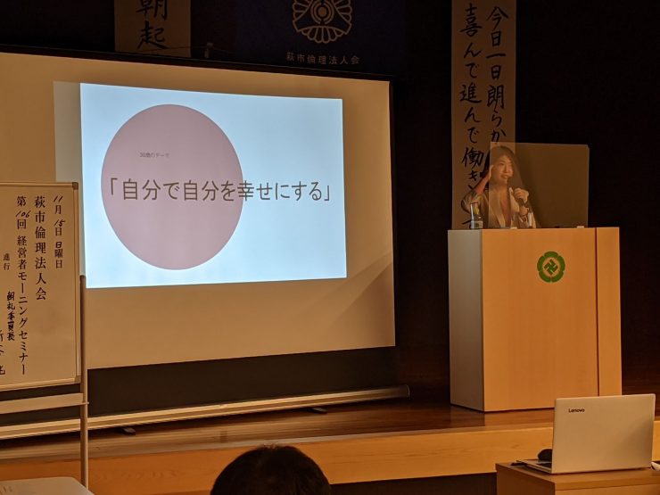 11月15日のモーニングセミナーは萩市倫理法人会モーニングセミナー委員長の前田笑子氏が心の拠り所を持つと題して講話をしてくれました。