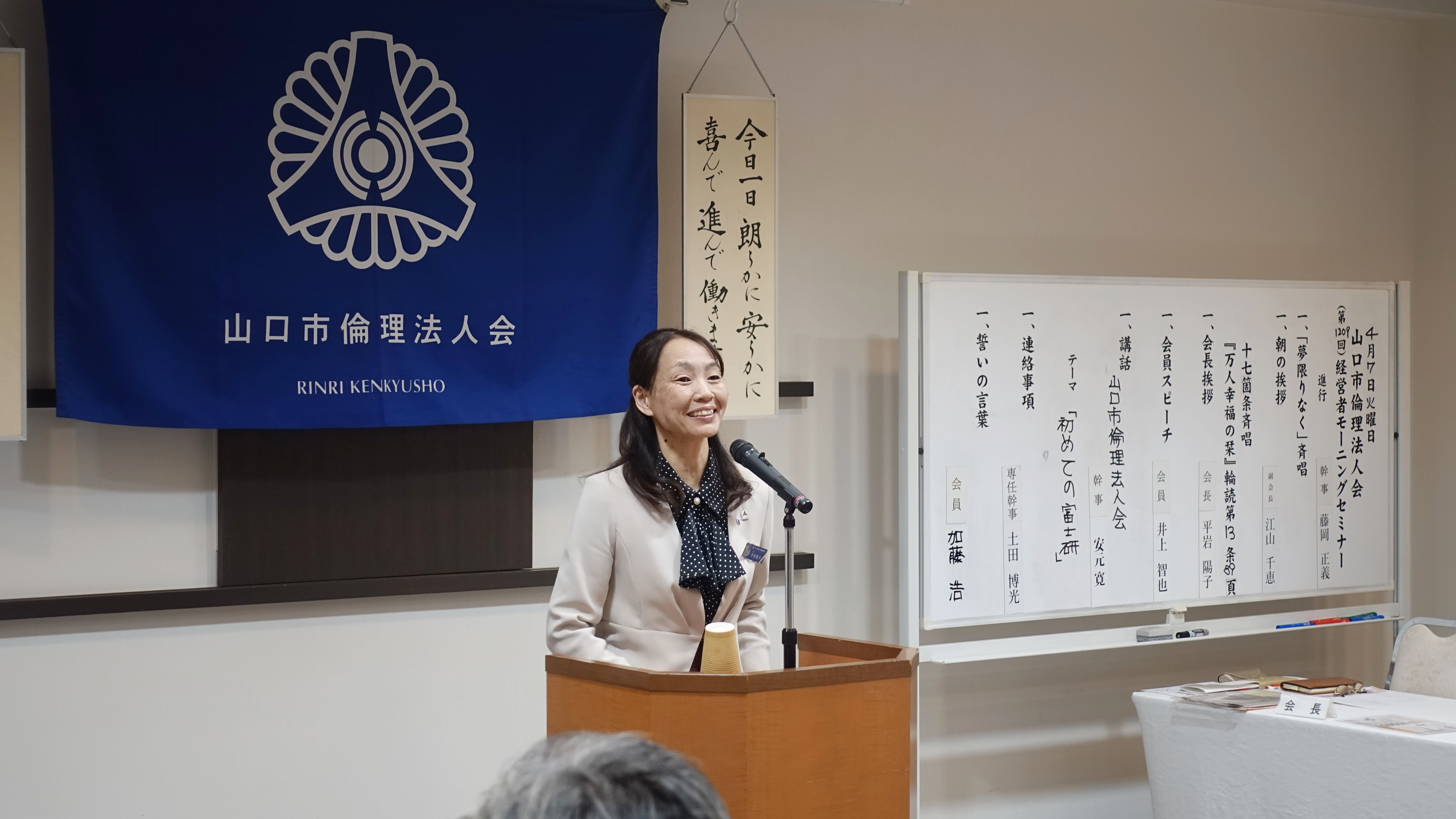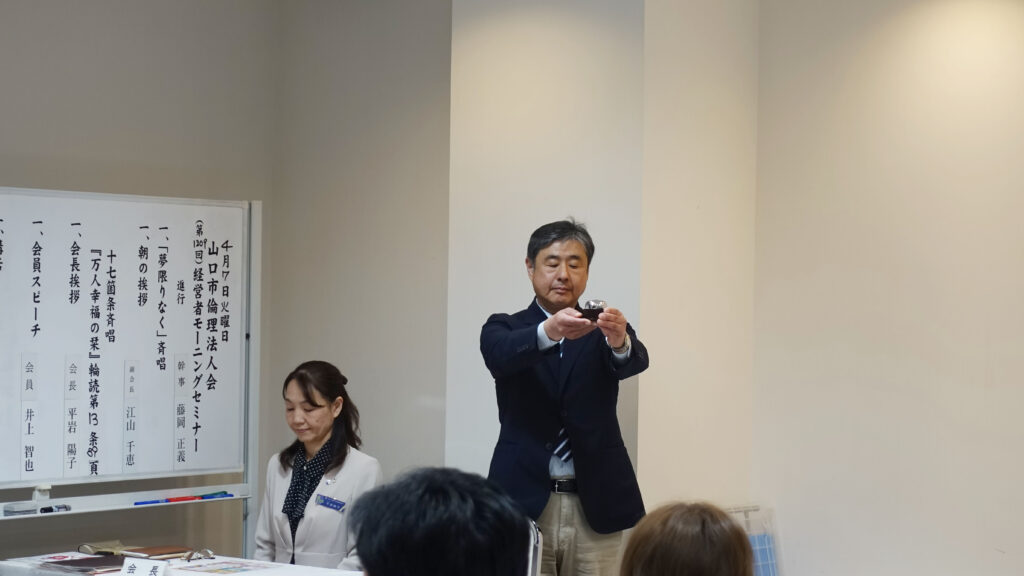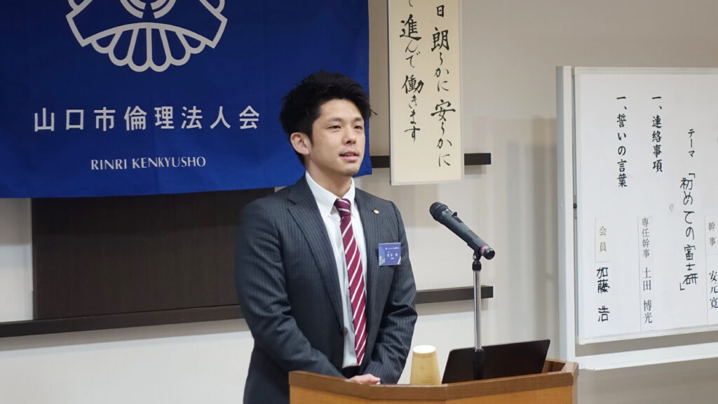 本日は山口市倫理法人会 幹事安元 寛さんの講話でした。初めて富士研に行かれ、色々な学びがあったんだなと感じました。講話を聞いて私も倫理塾の時に行った富士研を思い出しました!また、講和の中で色々な方に感謝を伝えられており、改めて感謝することの大切さを学ばせてもらいました。今後の更なるご活躍を楽しみにしております!