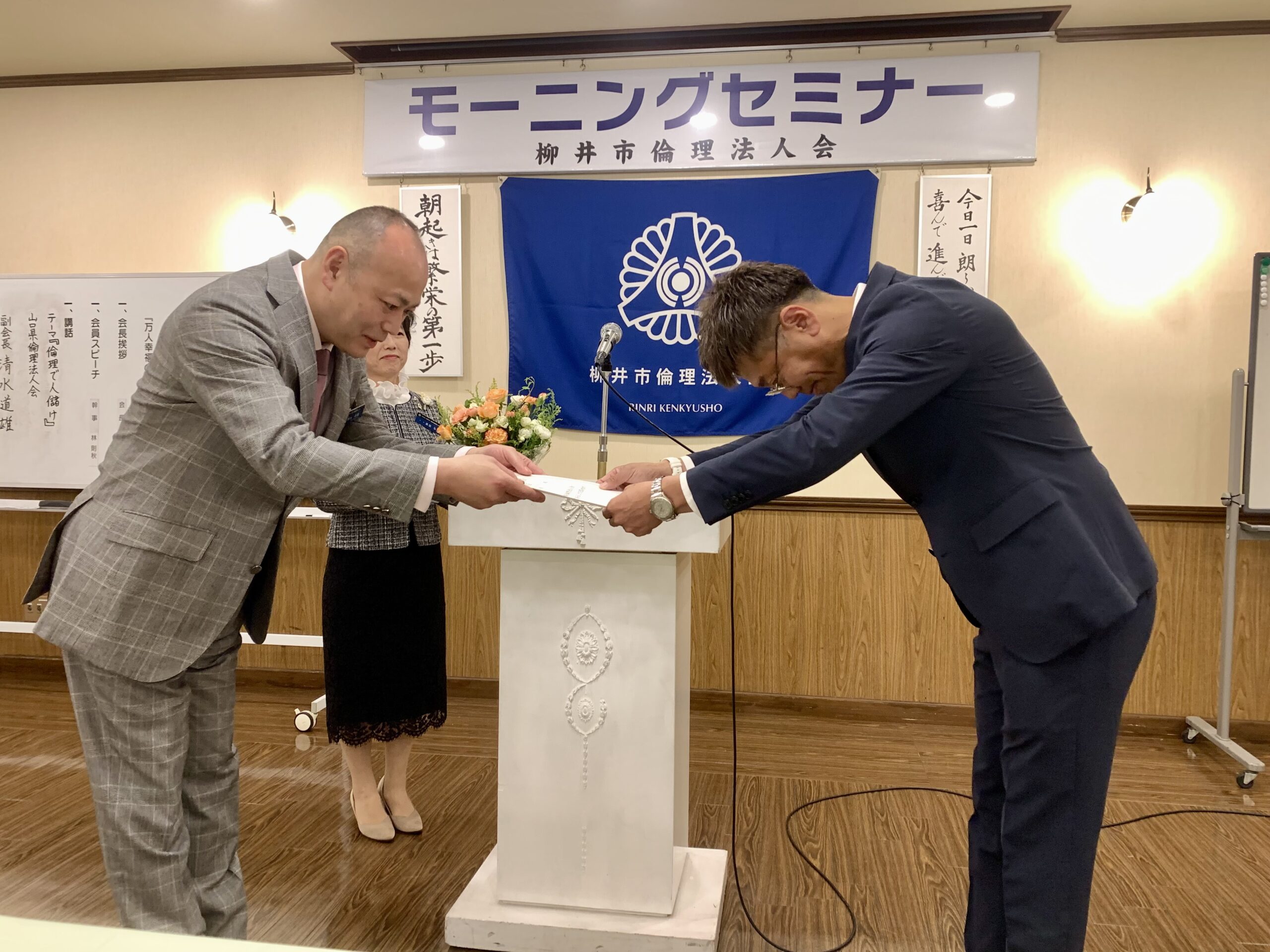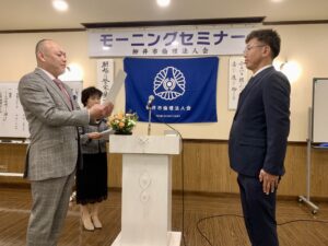 新入会員の株式会社サンメディカの池田憲二様へ本日の講師で山口県副会長である清水様より会員証が授与されました。