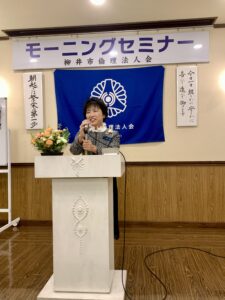 「倫理で人儲け」と題し、若かりし頃の仕事と私生活の失敗談から始まり、倫理と出会って色々なお役を受けることと、自分を助けてくれている人たちに気づいたことによって自身が変わり、周りも変わって行った体験をお話しされました。