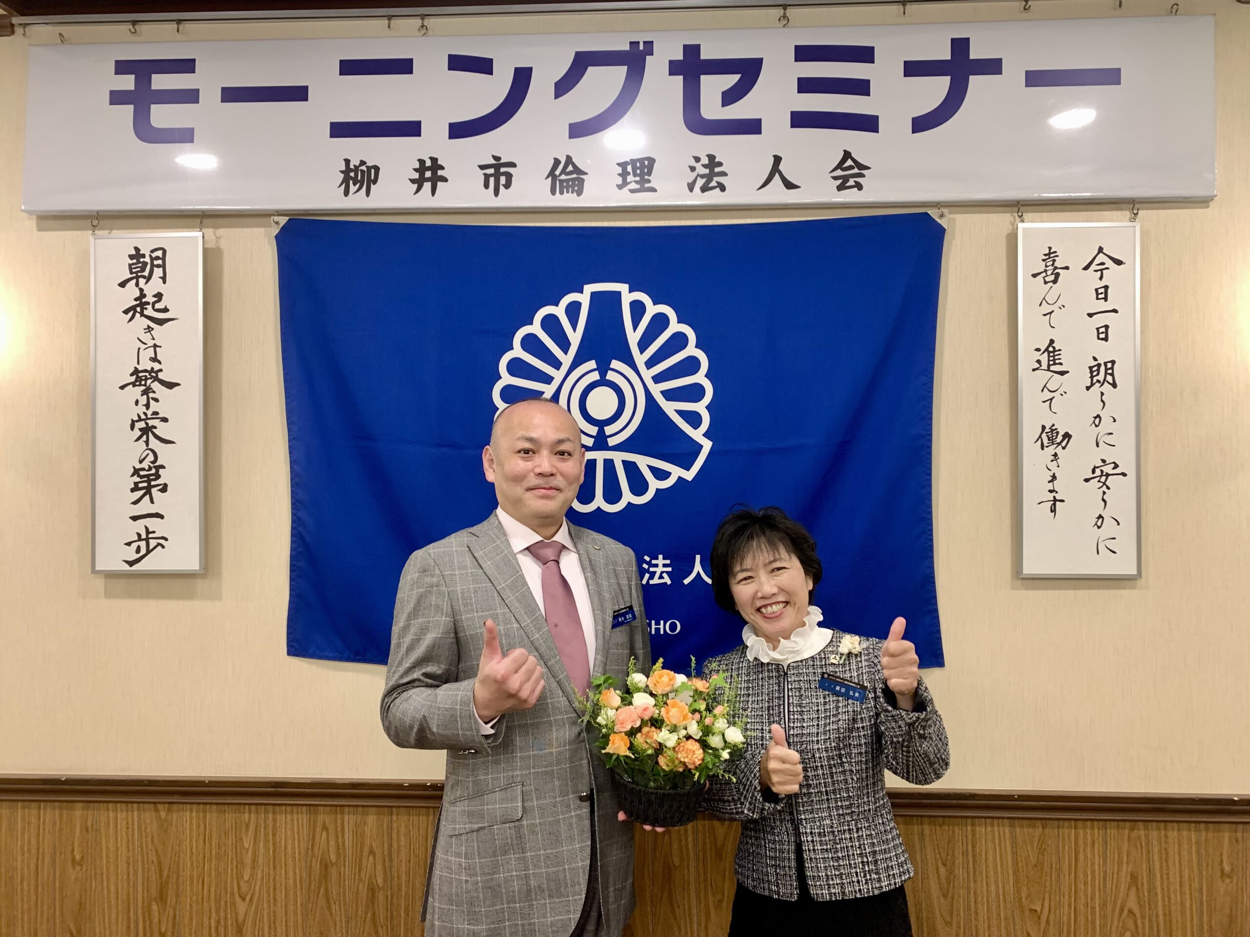 新会員の池田様 健康サロンを経営されており柳井市の皆さんに日々情報を発信されており、倫理法人会でご自身の学びを深めたいと意気込まれておりました。またお仕事の他には家庭では子育てと多くの趣味を楽しまれているとお話しされました。