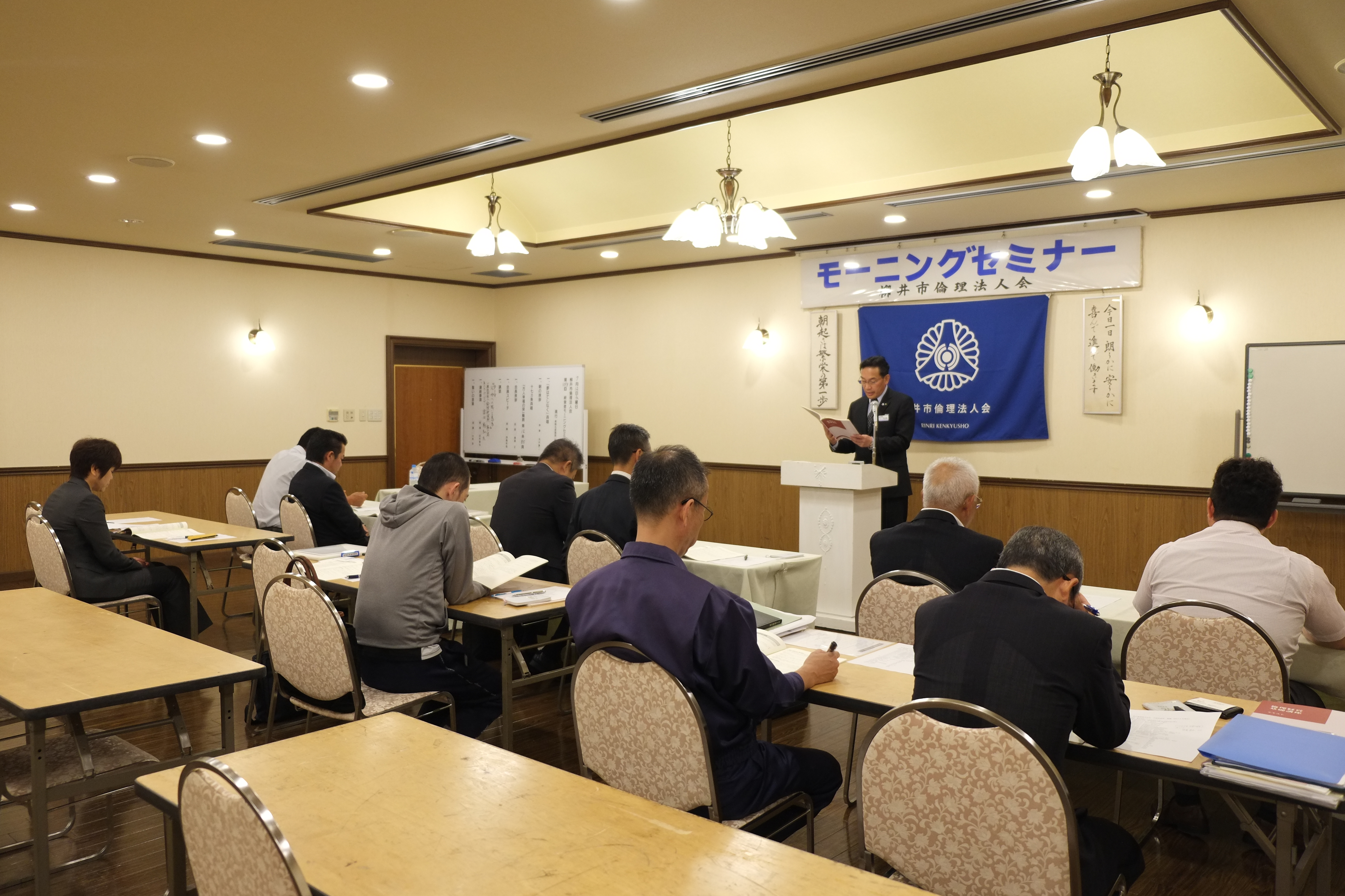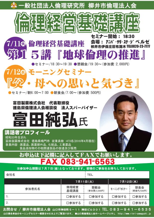7月11日(火)に開催された倫理経営基礎講座は、徳島県倫理法人会相談役 法人スーパーバイザー 富田 純弘 氏(富田製薬株式会社 代表取締役)を講師に迎え、倫理経営基礎講座テキスト第15項「地球倫理の推進」 を学びました。