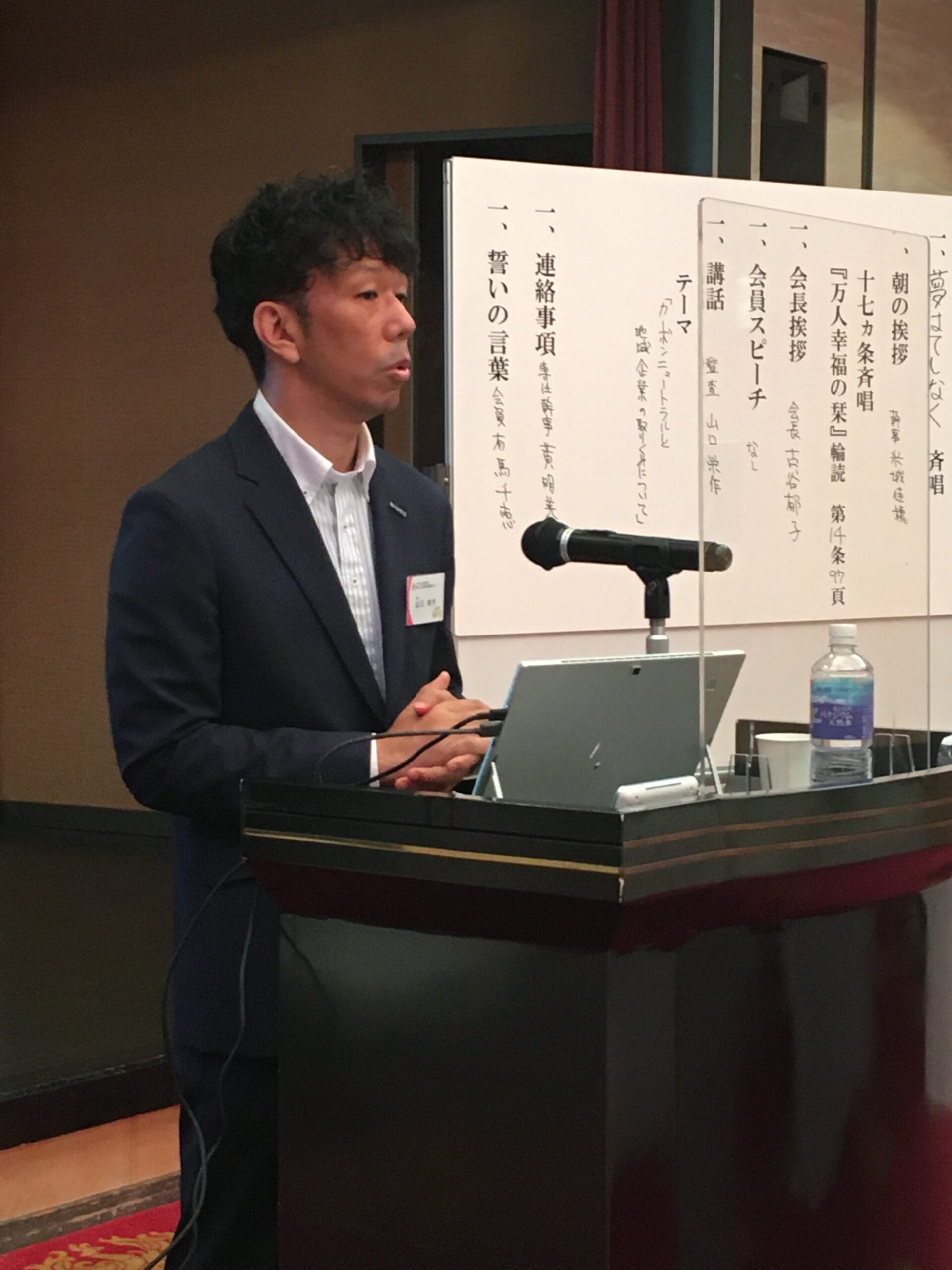 本日の美祢・山陽小野田倫理法人会モーニングセミナーは、美祢・山陽小野田倫理法人会 監査 富士商株式会社 取締役営業本部長 山口 栄作氏に「カーボンニュートラルと地域企業の取り組みについて」と題して御講話頂きました。