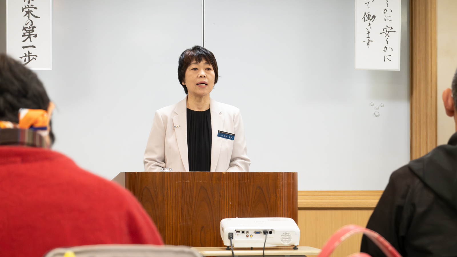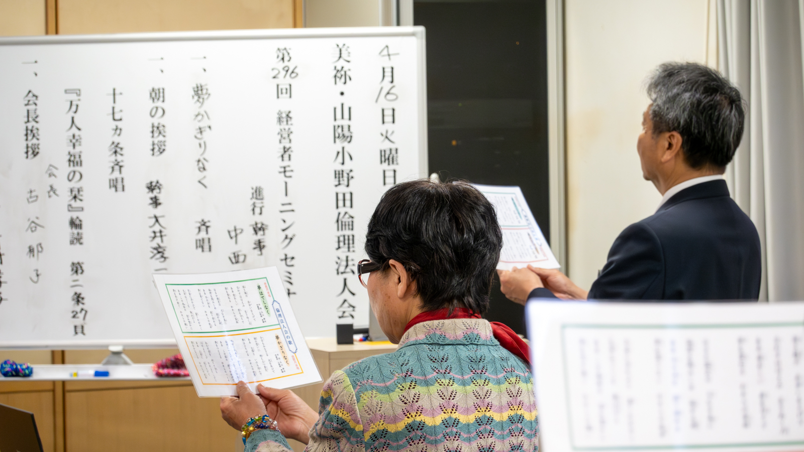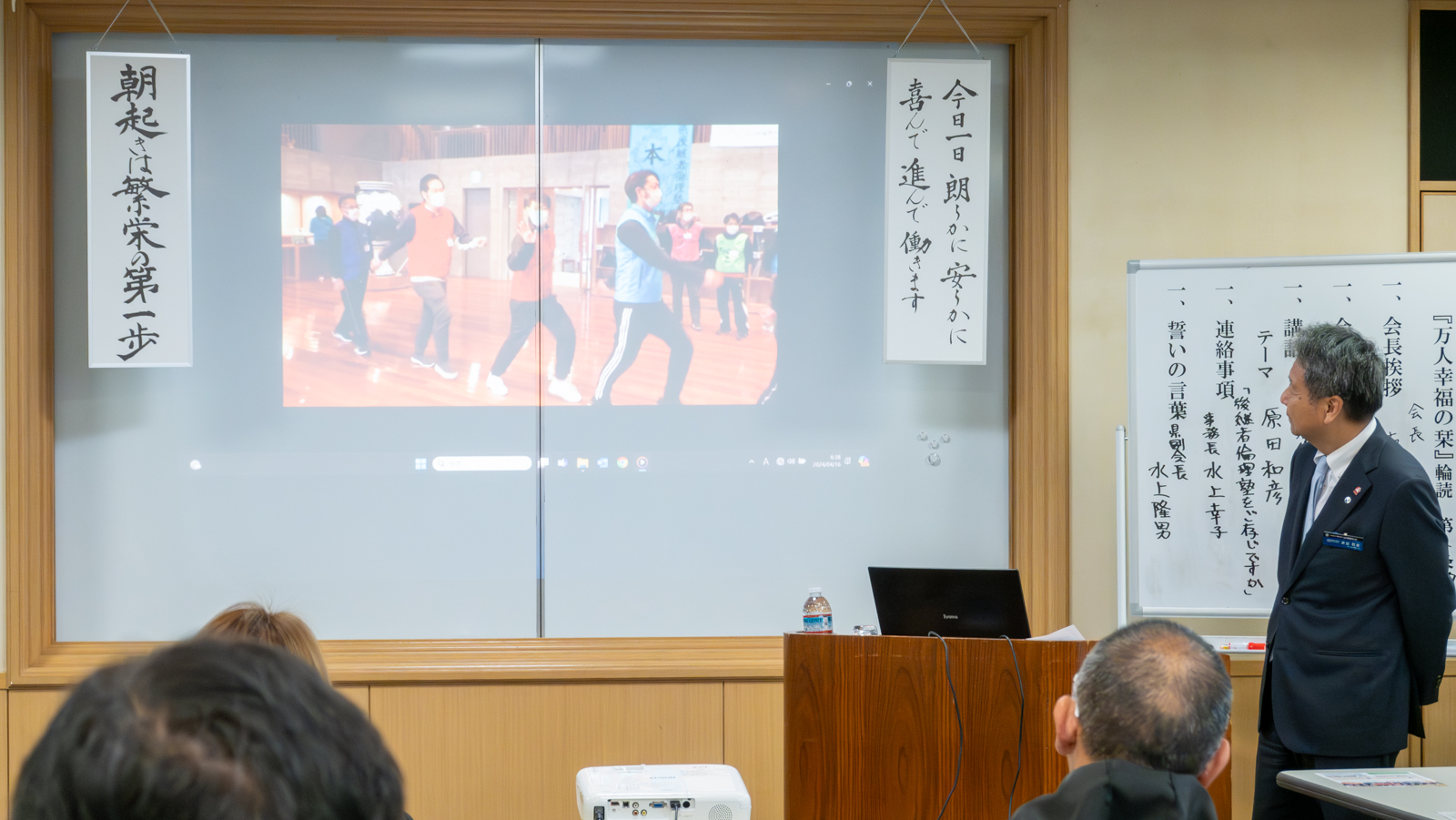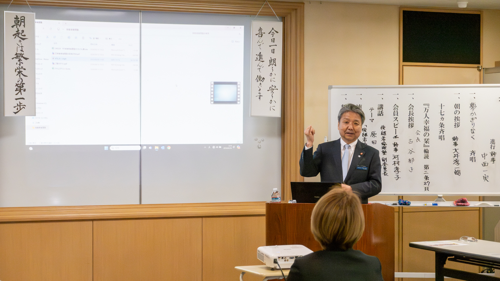 司会の中西さん、いつも背筋が伸びていて美しい立ち姿です。会長と二人で調和がいい感じです。これも倫理法人会で学ぶ効果ですね。社員教育としても役に立ちそうです。