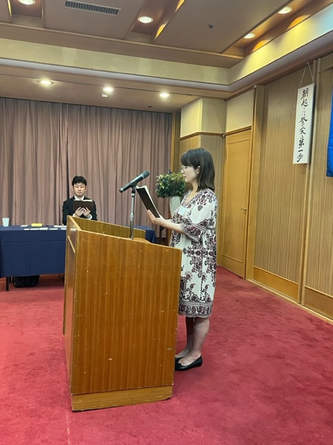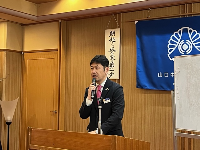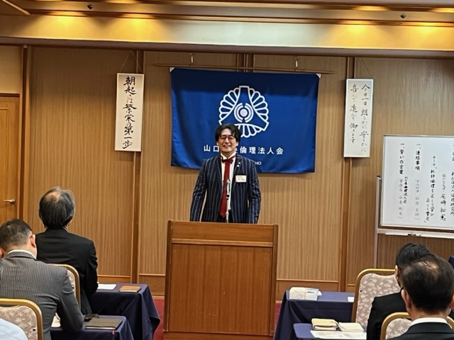 会員スピーチは、稲垣麻里事務長が先日行われた山口市倫理法人会との合同の天和会館と昭和の町の視察研修のお話をされました。講話では事業の成功は妻と両親を喜ばせることから、些細なことを疎かにすると大変なことになる、やり直しは出来なくても見直しは出来る、など学びました。