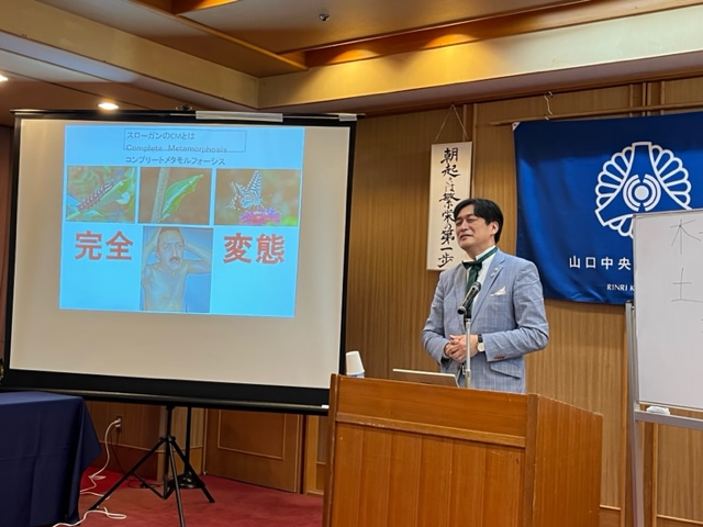 講話は、城戸会長から新年度の挨拶及び信念のお話でした。ご自身の体験された母や恩師への感謝の気持ちや御恩に報いるために挑んだ事のお話をされ、それから学んだ何事も情熱を持ってチャレンジし、あきらめなず、思い込みの枠にとらわれず、自分を本気で変える【Complete Metamorphosis】(完全変態)を目指しましょうと言うお話でした。