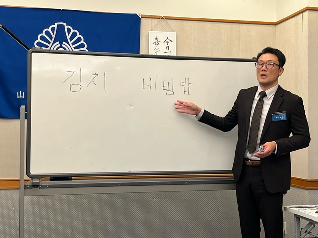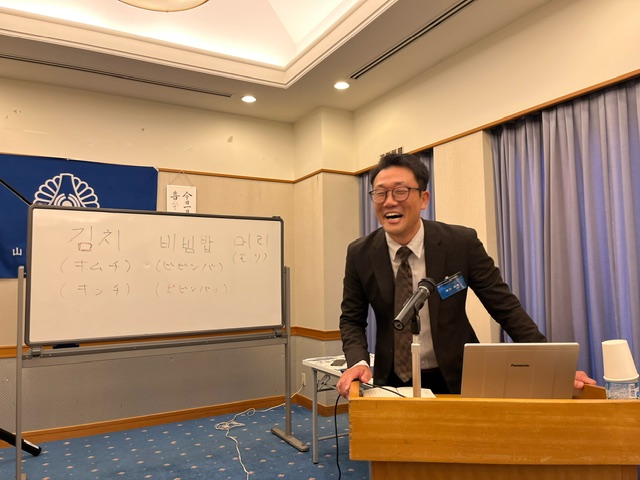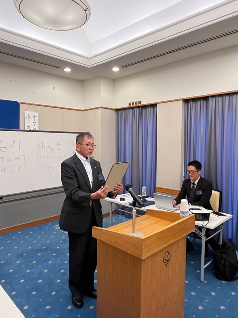 講話は、達川政龍運営委員が奥さまご来場の中されました。韓国学校の話や歌舞伎町で焼肉屋店長をされていた時のご苦労や芸能人によく会うなど楽しいお話をされました。後半は、韓国語講座となり、キムチやビビンバなどの正しい発音やハングル文字をわかり易く解説していただき、終始楽しくタメになる講話でした。