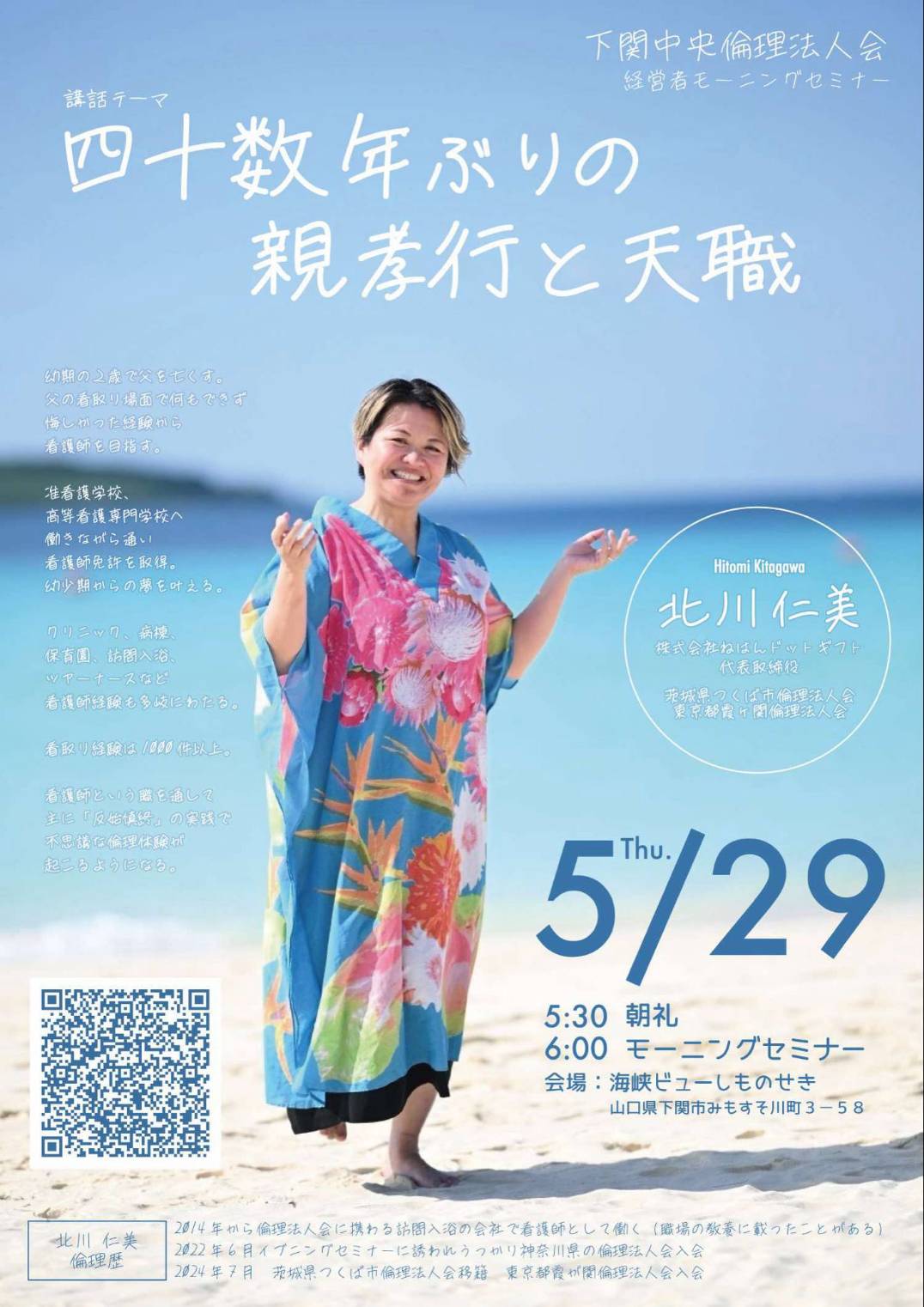『40数年ぶりの親孝行と天職』と題しまして、 北川 仁美氏(茨城県つくば市倫理法人会会員 株式会社ねはんドットギフト代表取締役)にご登壇していただく予定です。