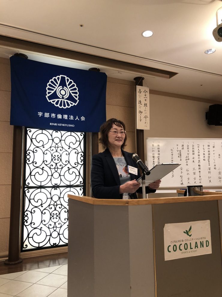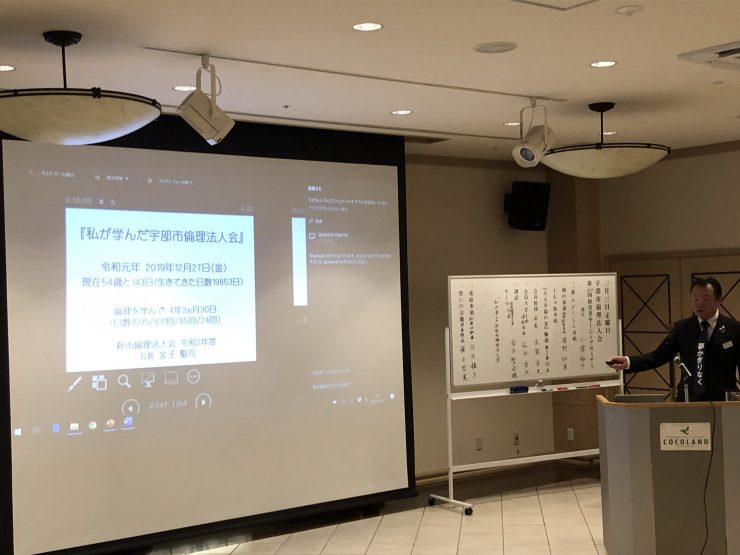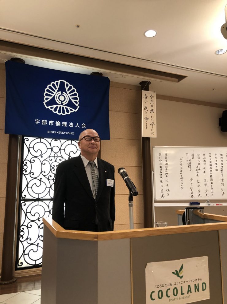 「私が学んだ宇部市倫理法人会」の題名にちなみ、入会から今に至るまでの貴重な体験を紹介されました。