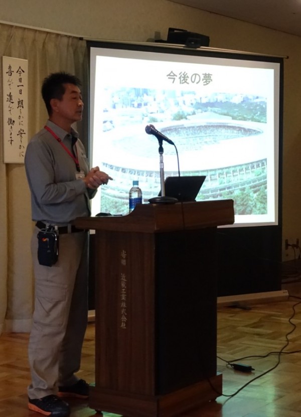 創業100年を超える7代目社長の岡崎社長、ユニークな自己紹介と施行例を交えながら会社紹介から講話が始まりました。5年前の東日本大震災では、会社を挙げてボランティアに行かれたとのこと。その経験を活かし、親友と簡単に低コストで出来る仮設住居を開発したところに熊本で地震が起きました。コンパネを使ってどこでも簡単に作ることができるようにしましたが、利用してもらう相手先が見つからず途方に暮れていたそうですが、動けば道が開けることを実感したそうです。その後、山口高校の生徒さんとボランティア活動を行うことになった経緯をお聞きし、最後に大きな夢を抱かれていることを聞くことができました。