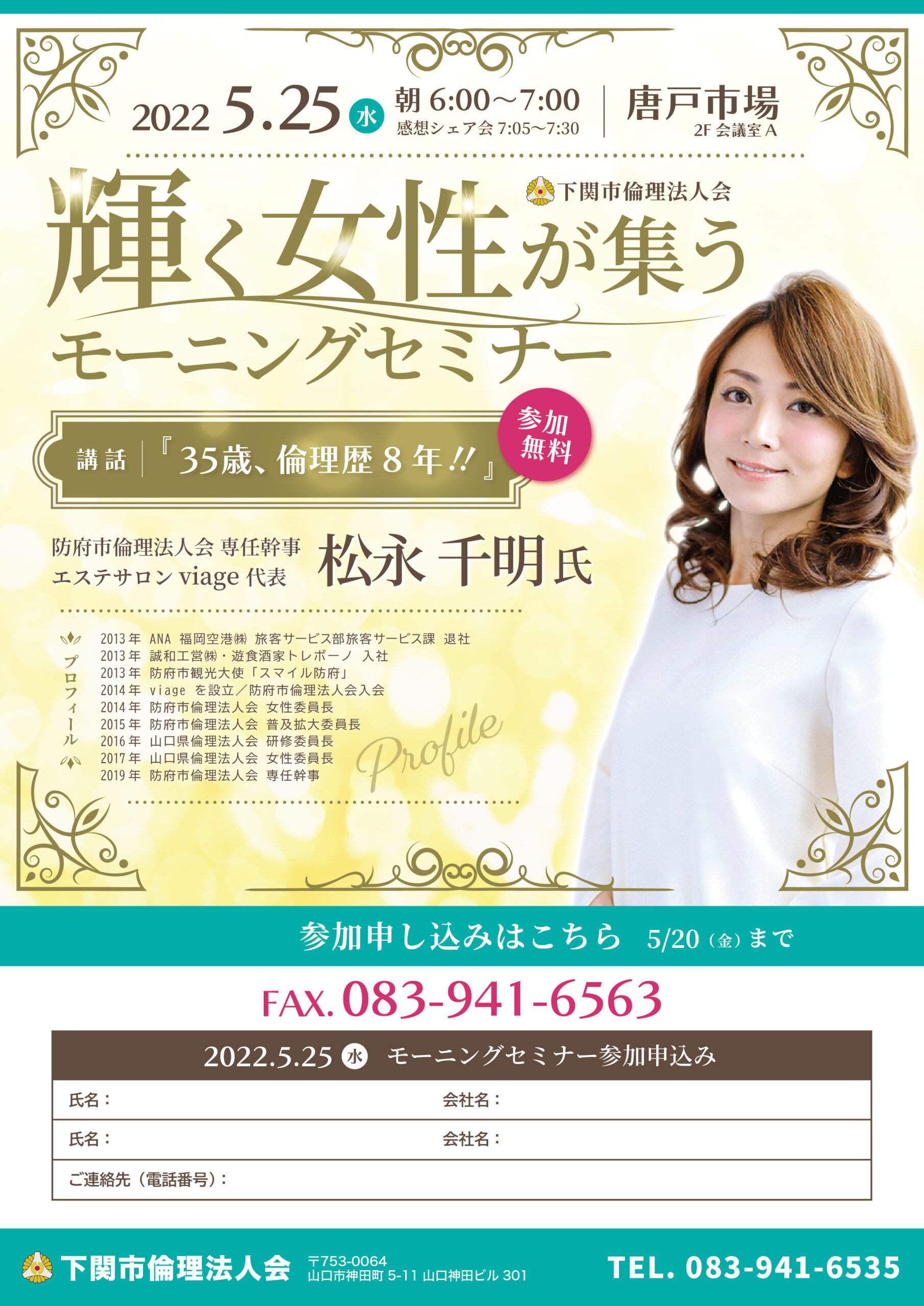 2022年5月25日(水) 第892回 MS 講師:松永 千明 氏(防府市倫理法人会 専任幹事 / エステサロン viage 代表)/テーマ:輝く女性が集うモーニングセミナー 「35歳、倫理歴8年!!」