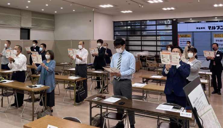 第96回のモーニングセミナーは、田町商店街の中のイベントホール、JOY201で行われました。いつもの立志殿で行われるモーニングセミナーの厳粛な雰囲気とは違い、早朝の田町商店街に音楽や元気な声が響き渡る活気のあるモーニングセミナーとなりました。