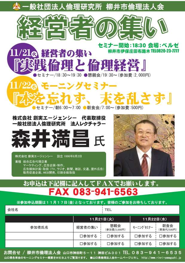 お問合せ山口県倫理法人会 事務局  TEL:083-941-6535  FAX:083-941-6563