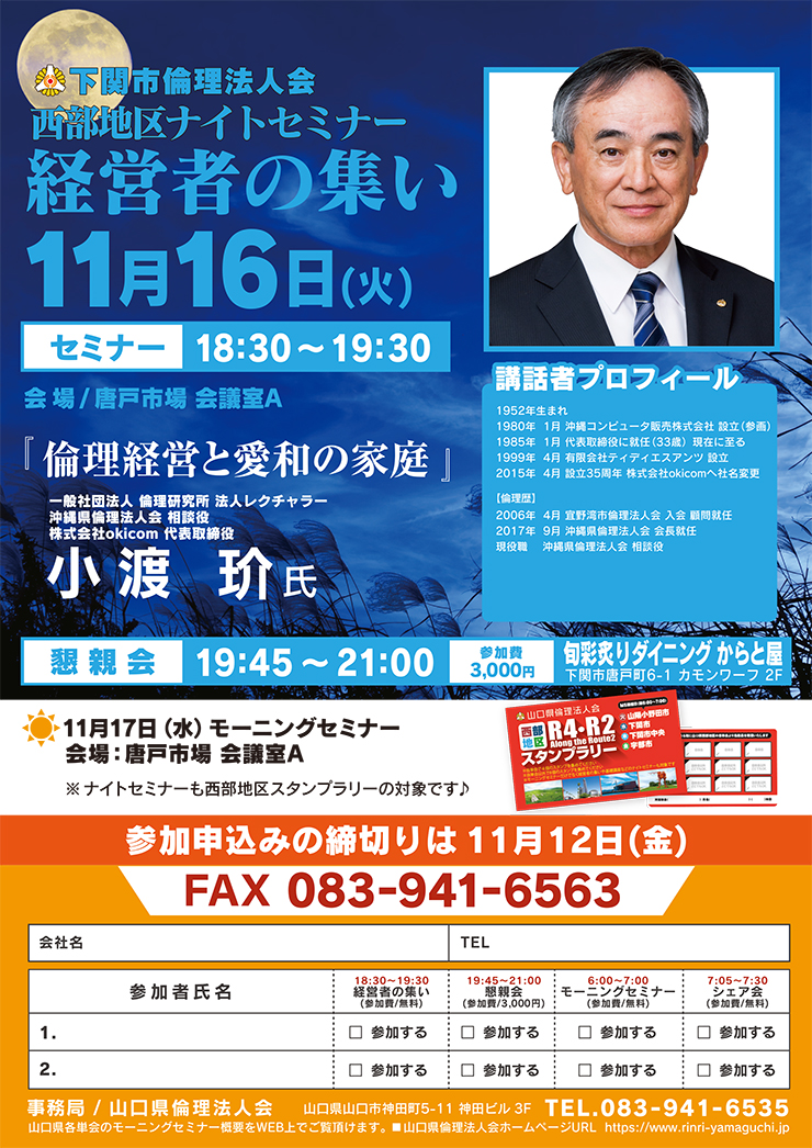 下関市倫理法人会 西部地区ナイトセミナー 経営者の集い 講話 一般社団法人倫理研究所 法人レクチャラー 沖縄県倫理法人会 相談役 株式会社okicom 代表取締役 小渡 玠氏 テーマ 倫理経営と愛和の家庭 日時 2021年11月16日(火)18:30~19:30 会場 唐戸市場 会議室A
