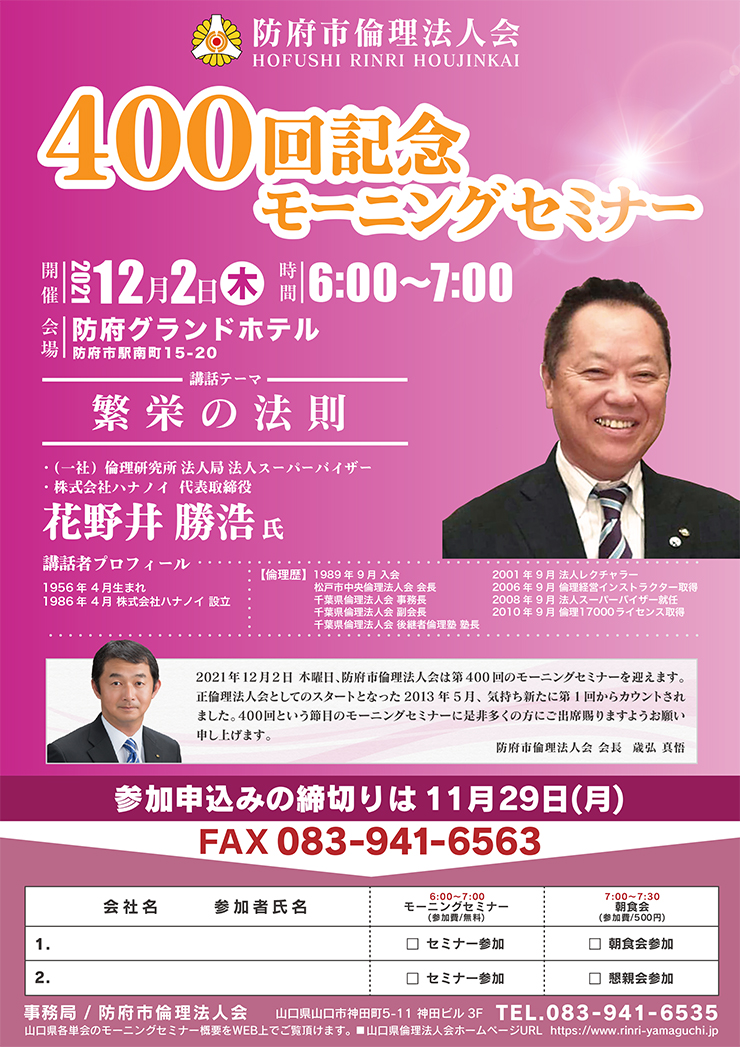 防府市倫理法人会 400回記念モーニングセミナー 講話 (一社)倫理研究所 法人局 法人スーパーバイザー株式会社ハナノイ 代表取締役 花野井 勝浩氏 テーマ 繁栄の法則 日時 2021年12月2日(木)6:00~7:00 会場 防府グランドホテル