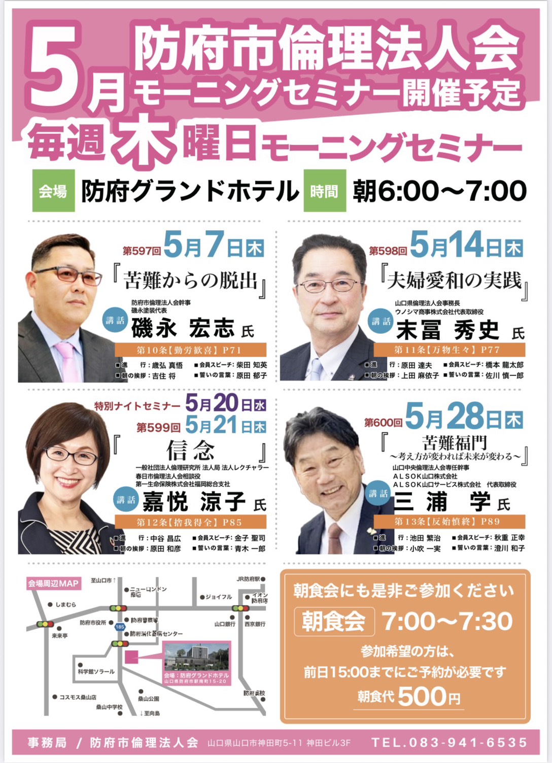 | 朝食 | 朝食をご希望の方は事務局までお申し出ください。※朝食代金は別途必要です。 ※現在、コロナ禍のため地域によって朝食会を中止する場合がございます。お申し込みの際には、各単位法人会から送付しております「経営者モーニングセミナーのご案内」をご確認いただくか、山口県倫理法人会事務局へご確認ください。 |