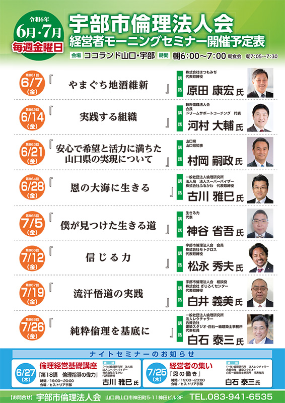 毎週金曜日、朝 6:00 〜 7:00 ココランド宇部にてモーニングセミナーを開催しています!