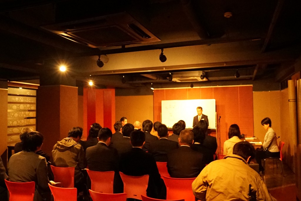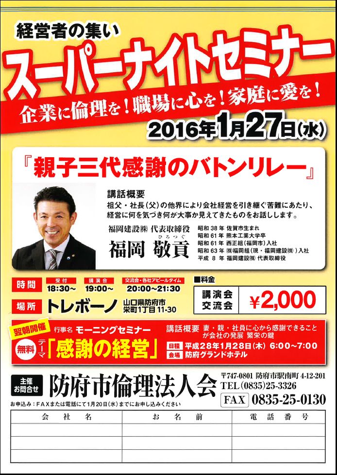 スーパーナイトセミナー。講師の法人レクチャラー福岡敬貢様の、25歳の先代の突然の死によって突然3代目として