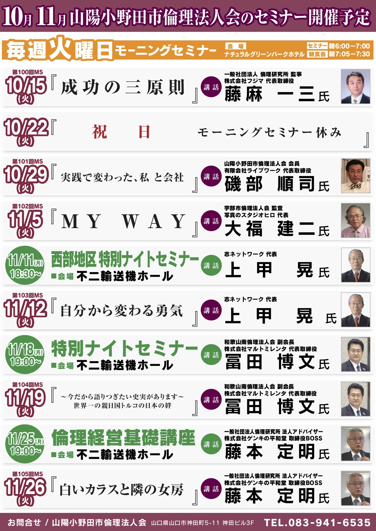 10月11月 山陽小野田市倫理法人会モーニングセミナー開催予定 毎週火曜日、朝 6:00 〜 7:00 ナチュラルグリーンパークホテルにてモーニングセミナーを開催しています! 見学での参加も大歓迎です。