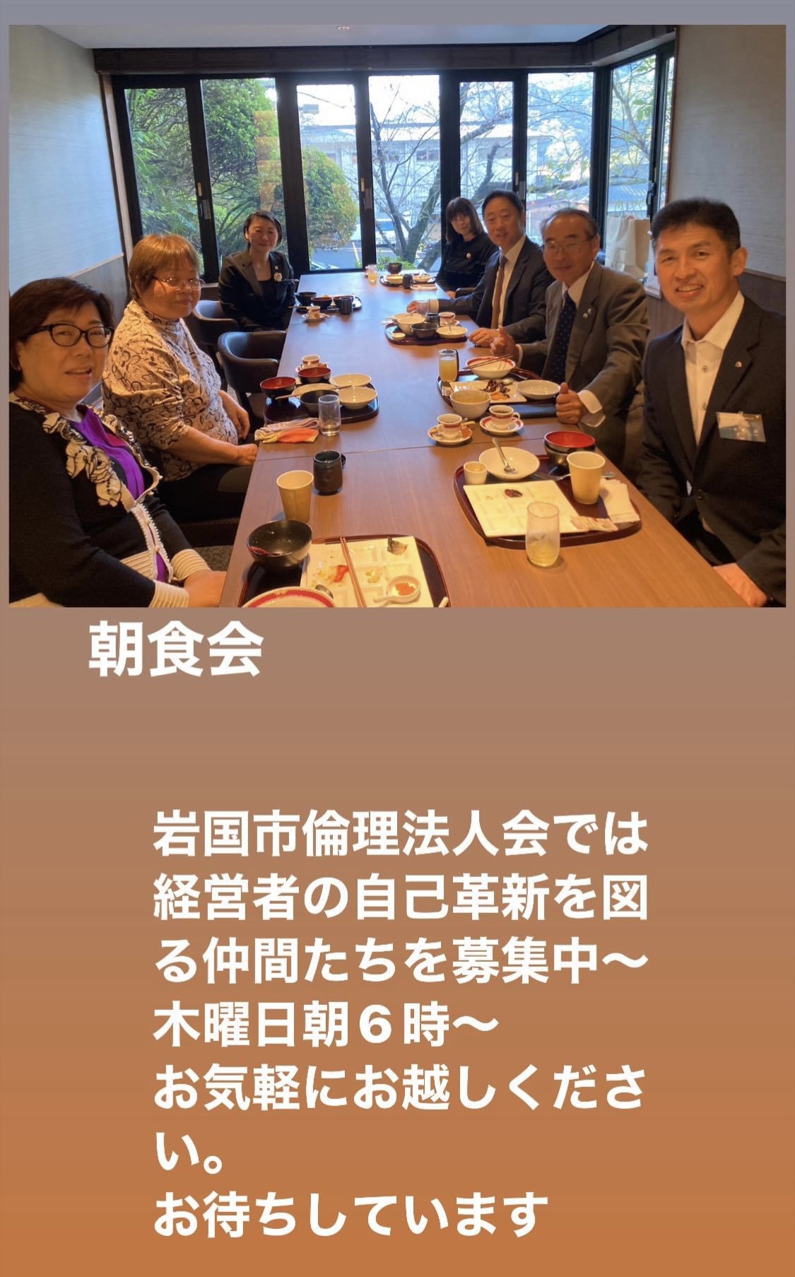| 朝食 | 朝食をご希望の方は事務局までお申し出ください。※朝食代金は別途必要です。 ※現在、コロナ禍のため地域によって朝食会を中止する場合がございます。お申し込みの際には、各単位法人会から送付しております「経営者モーニングセミナーのご案内」をご確認いただくか、山口県倫理法人会事務局へご確認ください。 |