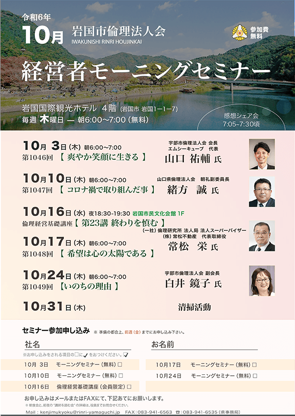 10月岩国市倫理法人会モーニングセミナー開催予定 朝食会1500円 講師を囲む会は5000円。前週(金)までの事前申し込みが必要です。 講師を囲む会は、つど場所が変わります。詳細は役員までお問い合わせください。