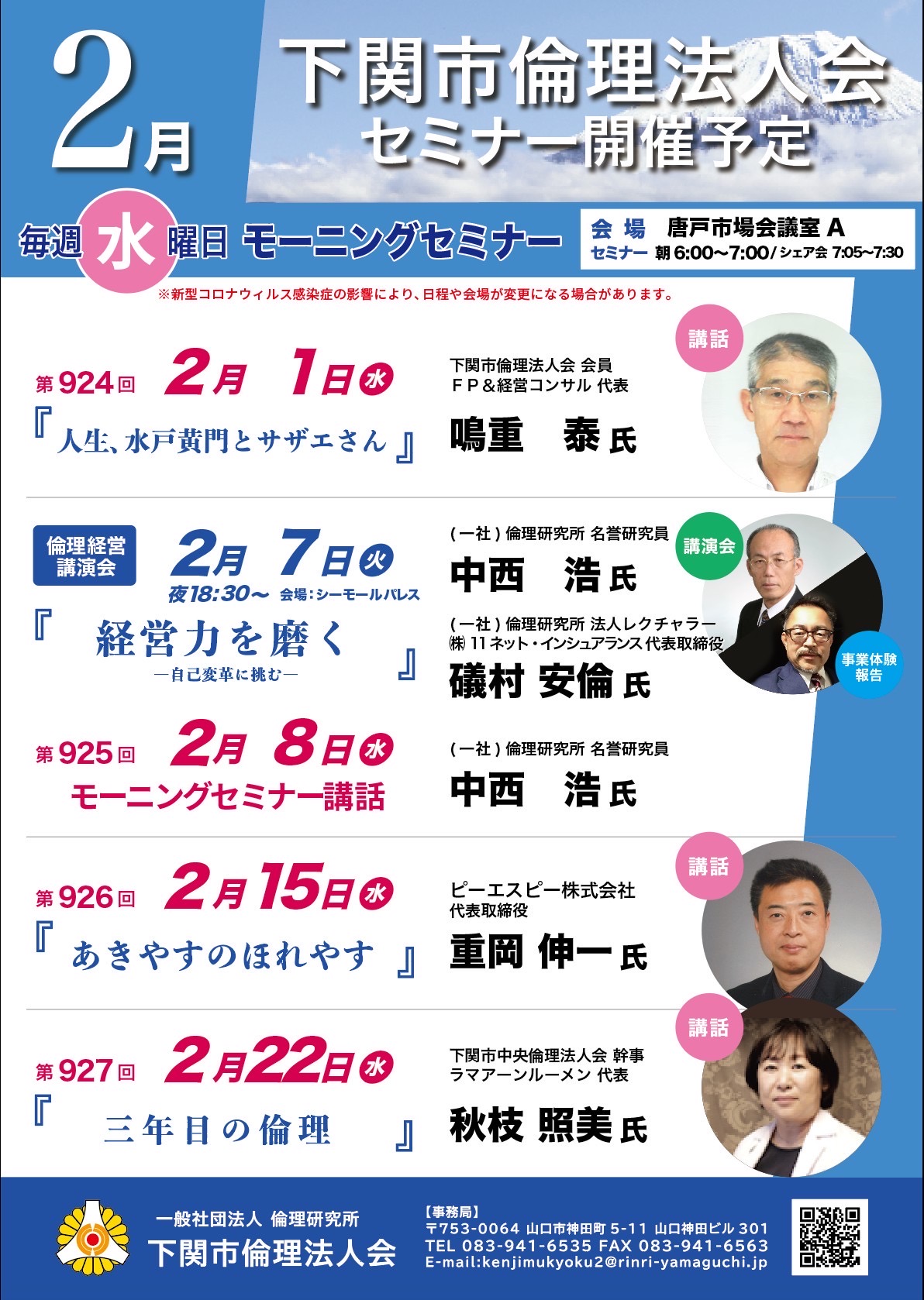 - Mセミナー第927回 MS 講師:秋枝 照美 氏(下関市中央倫理法人会 幹事 / ラマアーンルーメン 代表)/テーマ:三年目の倫理