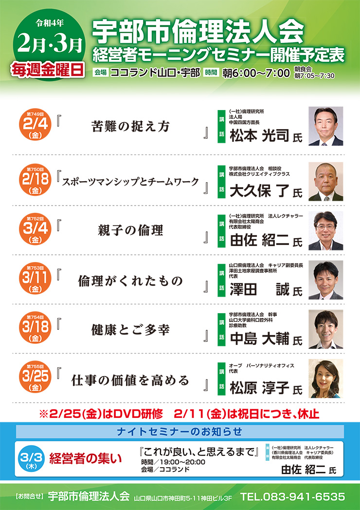 毎週金曜日、朝 6:00 〜 7:00 ココランド宇部にてモーニングセミナーを開催しています!