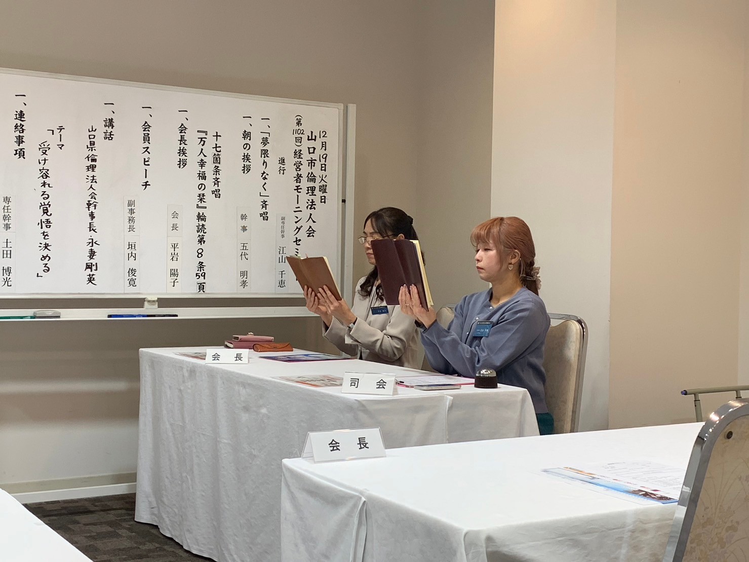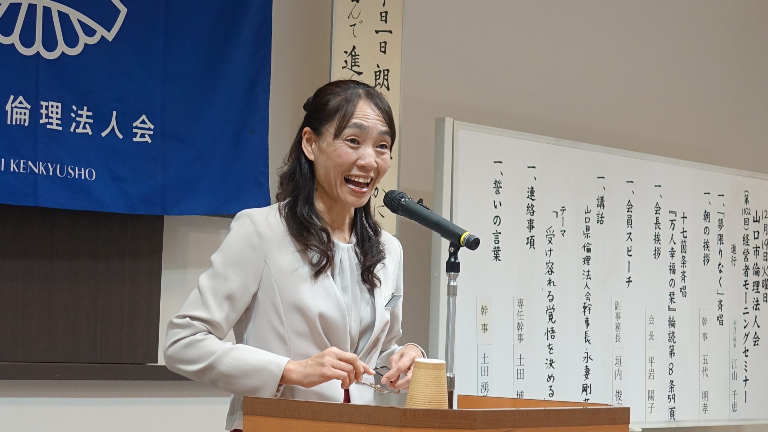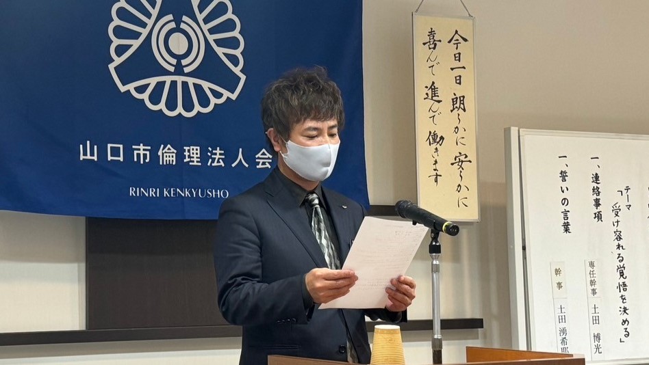 2023年12月19日(火) 2023年12月19日(火) 第1102回 MS 山口県倫理法人会 幹事長/ 永妻社会保険労務事務所 代表 永妻 剛英 氏  テーマ:『 受け容れる覚悟を決める 』
