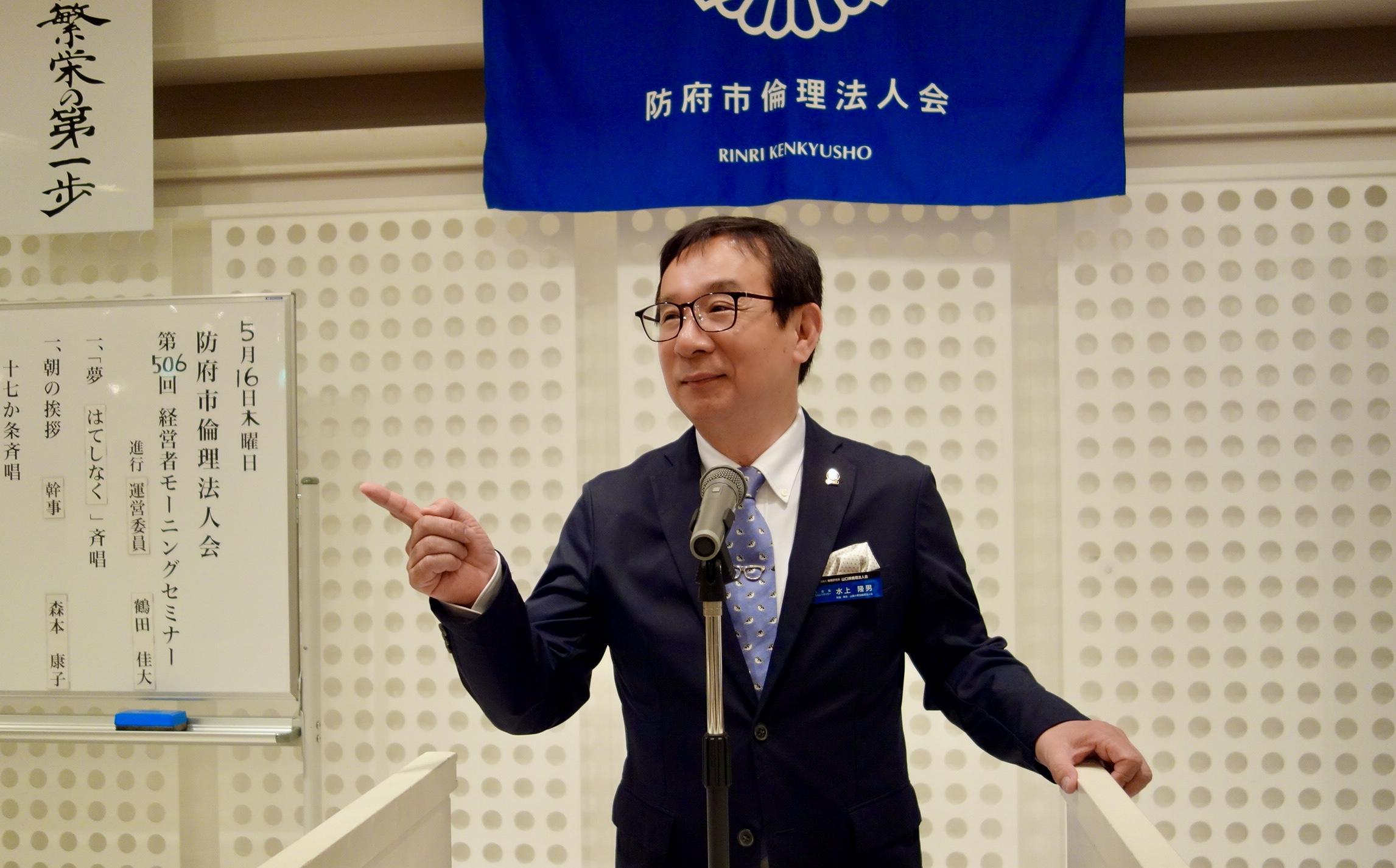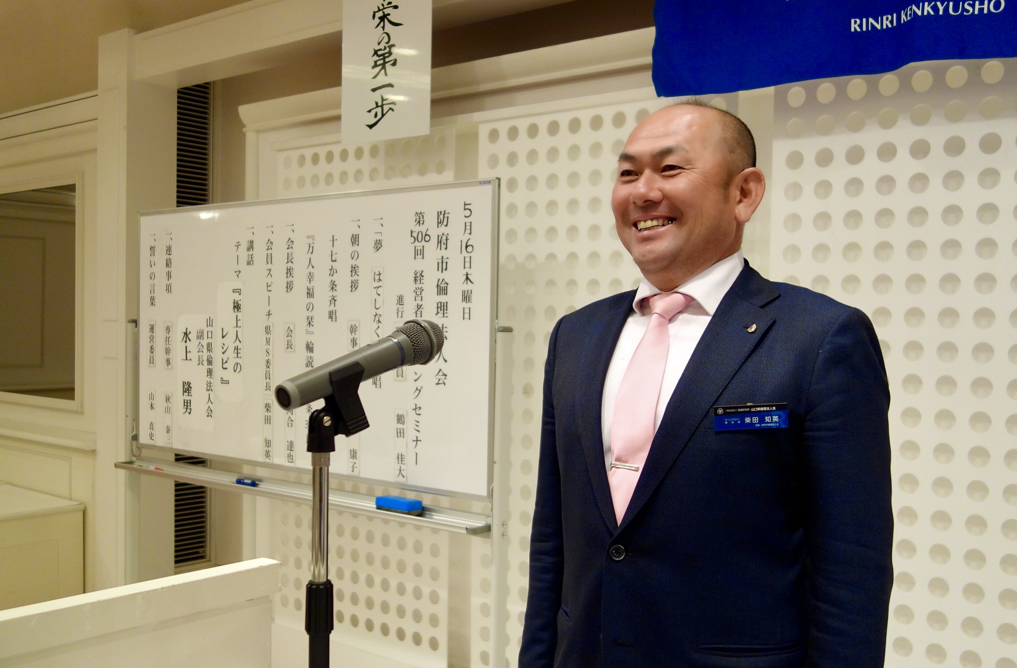 2024年5月19日(日) 2024年5月16日(木)第506回 講師:山口県倫理法人会 副会長 有限会社 みつや・トロアメゾン 代表取締役社長 水上隆男氏 テーマ:極上人生のレシピ