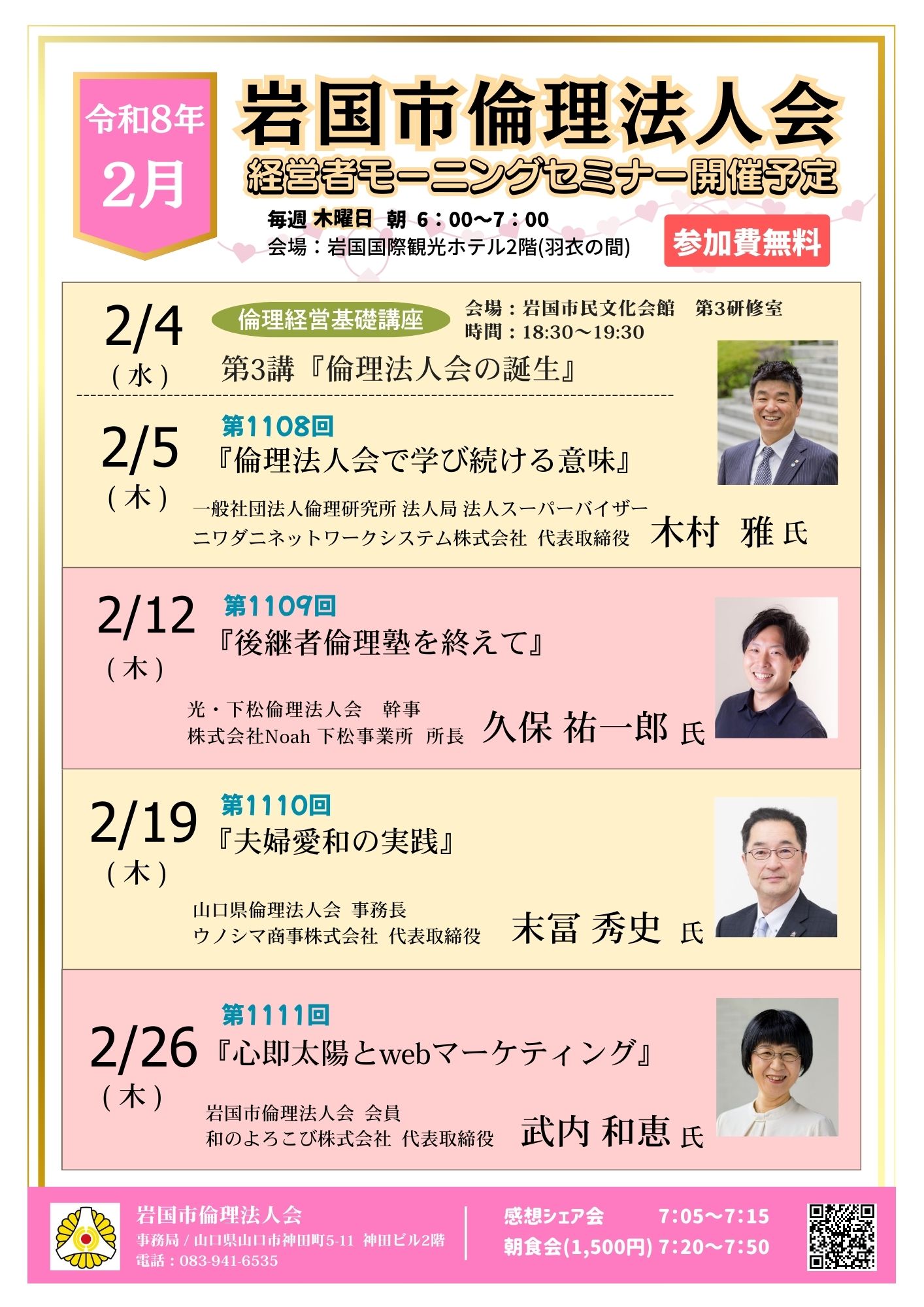 2月岩国市倫理法人会 モーニングセミナー開催予定 朝食会1,500円 講師を囲む会は5,000円。前週(金)までの事前申し込みが必要です。 講師を囲む会は、つど場所が変わります。詳細は役員までお問い合わせください。