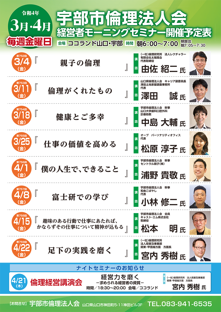 毎週金曜日、朝 6:00 〜 7:00 ココランド宇部にてモーニングセミナーを開催しています!
