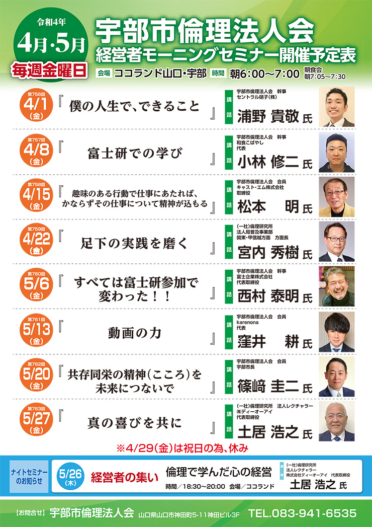 毎週金曜日、朝 6:00 〜 7:00 ココランド宇部にてモーニングセミナーを開催しています!