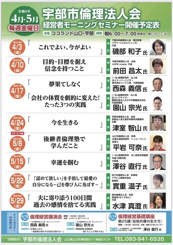 毎週金曜日、朝 6:00 〜 7:00 ココランド宇部にてモーニングセミナーを開催しています!