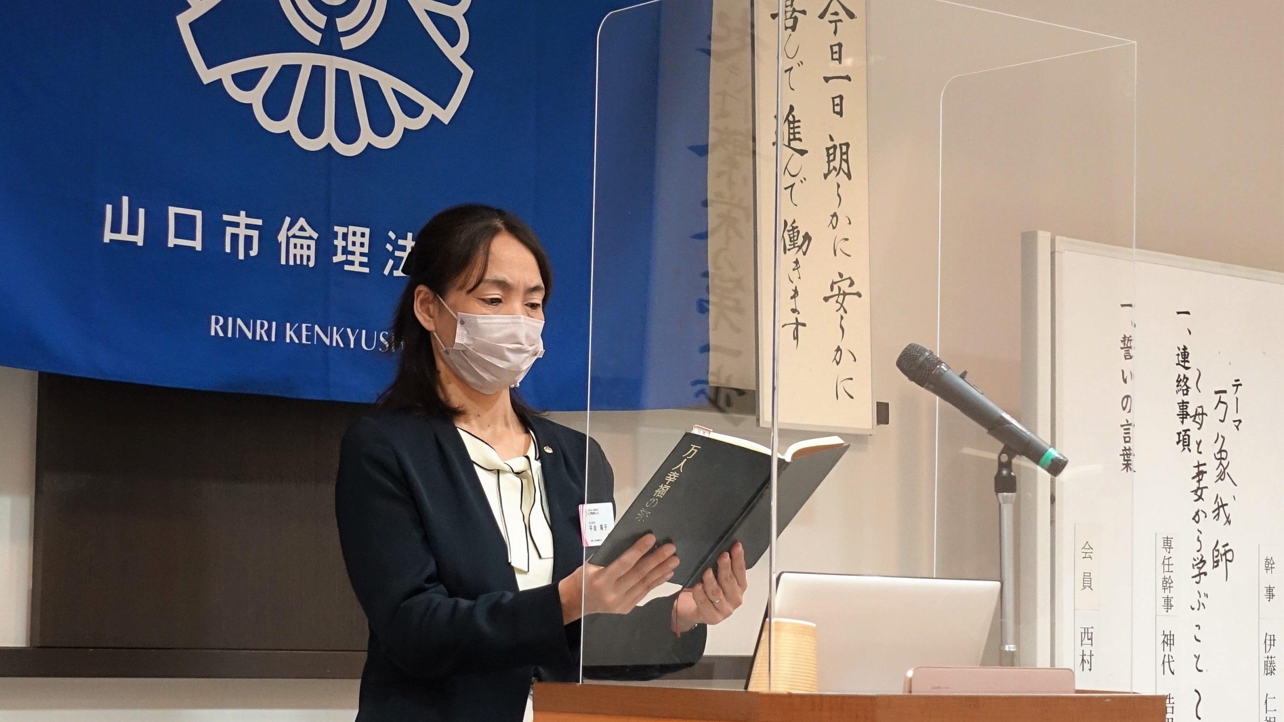朝の挨拶:平岩陽子県朝礼委員長:第十三条「反始慎終」