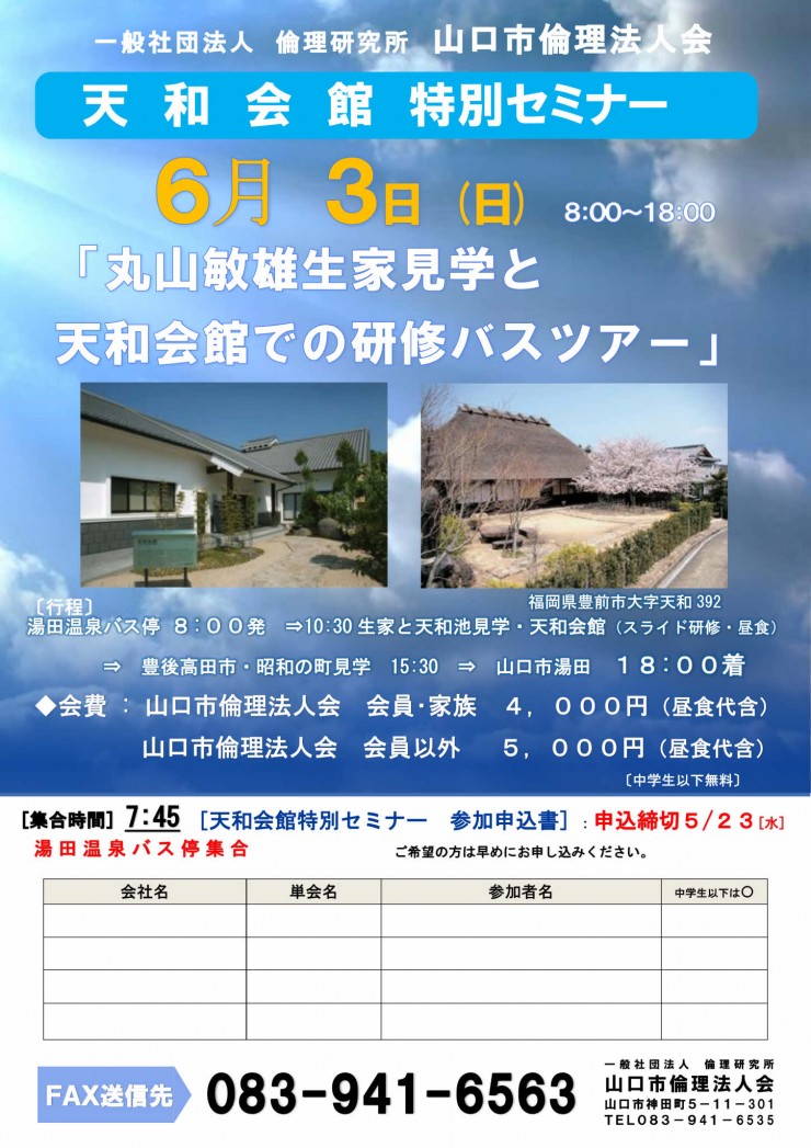 6月3日(日)、山口市倫理法人会で福岡県豊前市天和の丸山敏雄先生生家・天和会館研修会に行ってきました。山口市から8人、岩国市から4人の12人で研修してきました。日曜日にもかかわらず、会館の皆さんと豊前市倫理法人会若本監査、尾澤会長に生家、天和池、丸山家墓所などを案内していただき、天和会館で昼食後、特別な時だけ使われる会館セミナールームにて3分間スピーチを研修しました。梅雨の合間の好天に恵まれ、心地良い風を感じながら落ち着いた施設で特別な感覚で研修を行うことが出来ました。天和池や丸山家墓参、会館に戻りお弁当をいただき、スライド研修、そして研修室での決意表明や感想発表など約3時間の研修後、尾澤会長と会館の皆さんに「また、帰っていらっしゃい。」と車が見えなくなるまで手を振って見送っていただいた時には、胸が熱くなりました。その後、豊後高田市昭和の街を散策し、帰路に宇佐神宮を参拝して無事に帰ってきました。