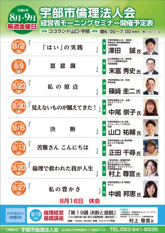 毎週金曜日、朝 6:00 〜 7:00 ココランド宇部にてモーニングセミナーを開催しています!