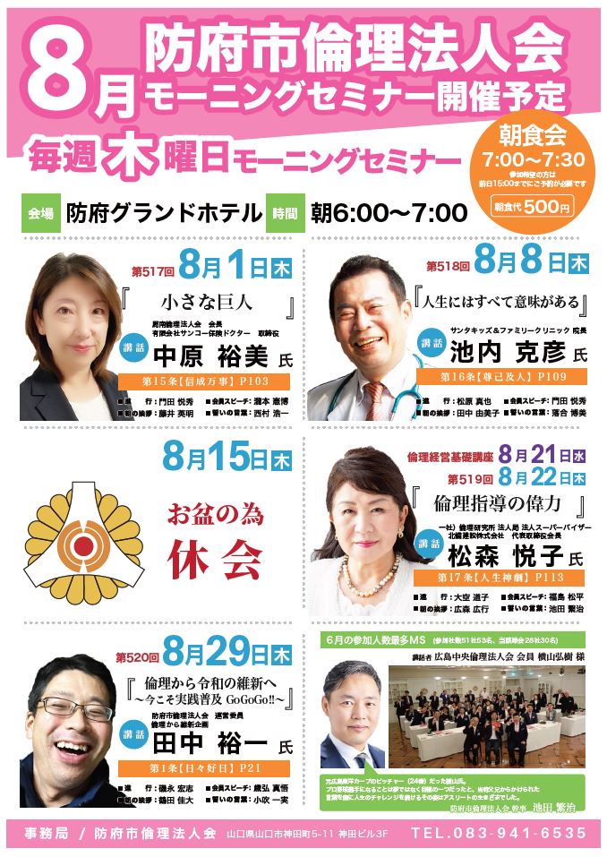 毎週木曜日、朝 6:00 〜 7:00 防府グランドホテルにてモーニングセミナーを開催しています! 見学での参加も大歓迎です。