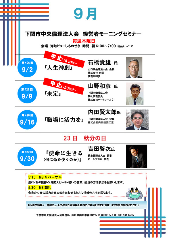 9月2日と9日のモーニングセミナーは中止とさせていただきます。