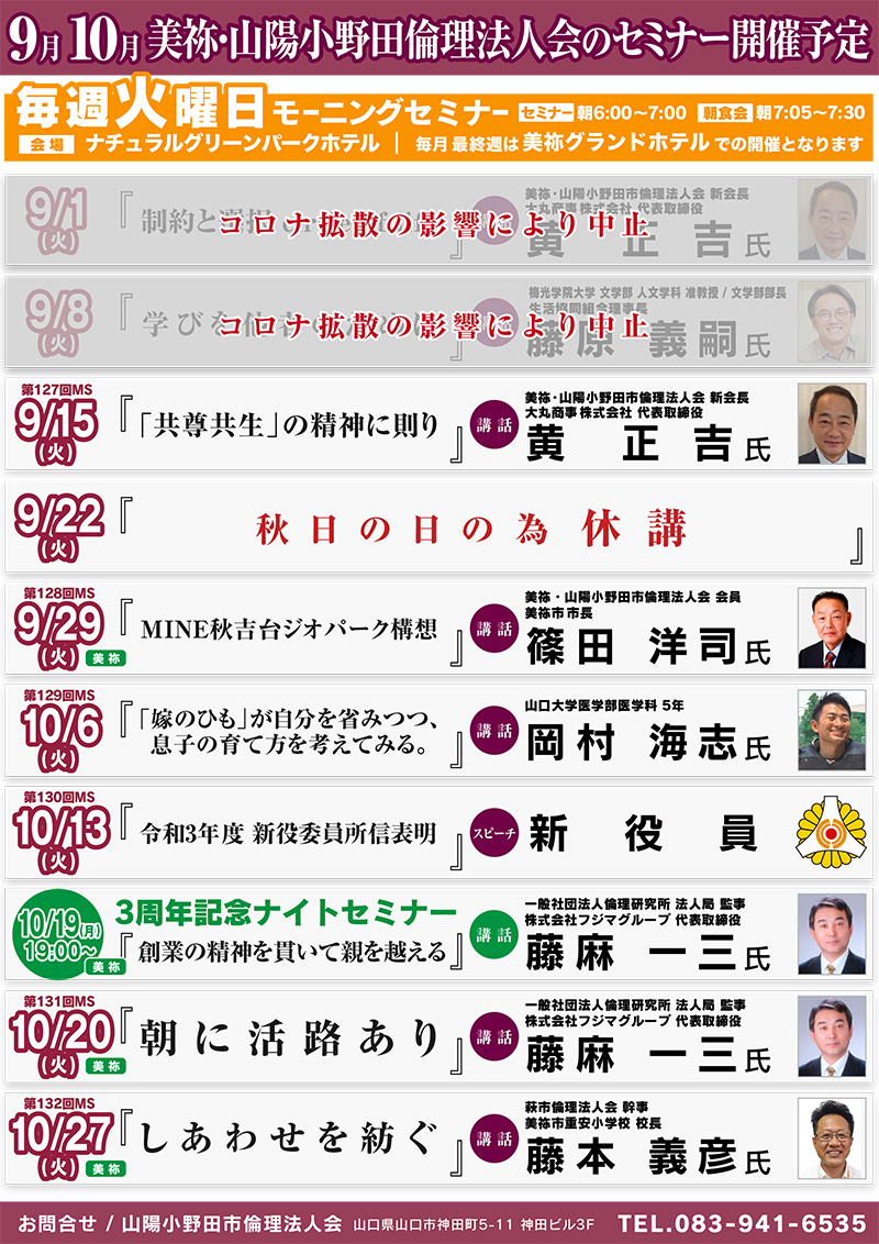 9月10月 美祢・山陽小野田倫理法人会モーニングセミナー開催予定 毎週火曜日、朝 6:00 〜 7:00 ナチュラルグリーンパークホテルにてモーニングセミナーを開催しています! 見学での参加も大歓迎です。