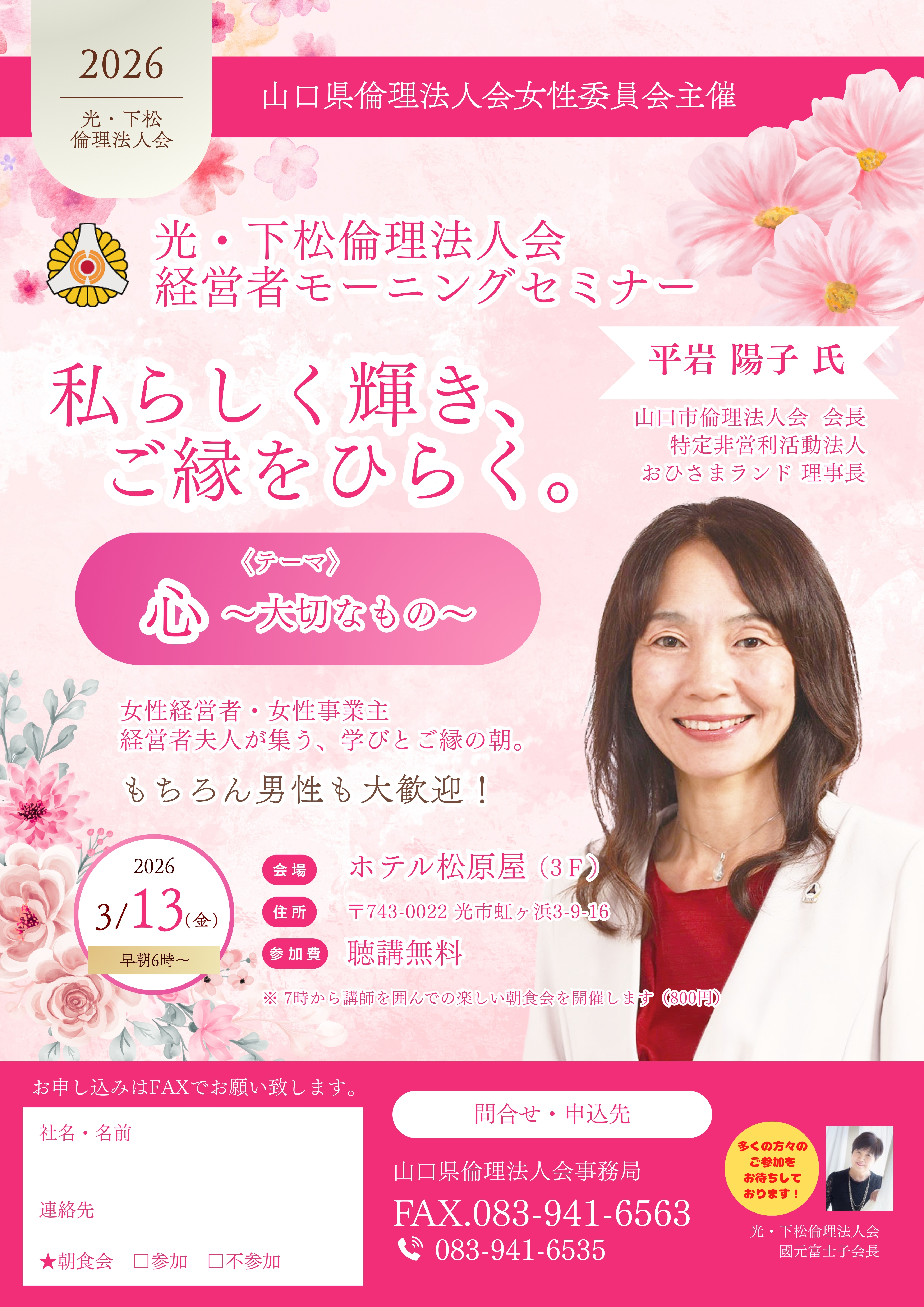 光下松倫理法人会 第732回経営者モーニングセミナーは 山口県女性委員会主催の光・下松倫理法人会特別モーニングセミナーです! 多くの方々のお越しをお待ちしております! ...