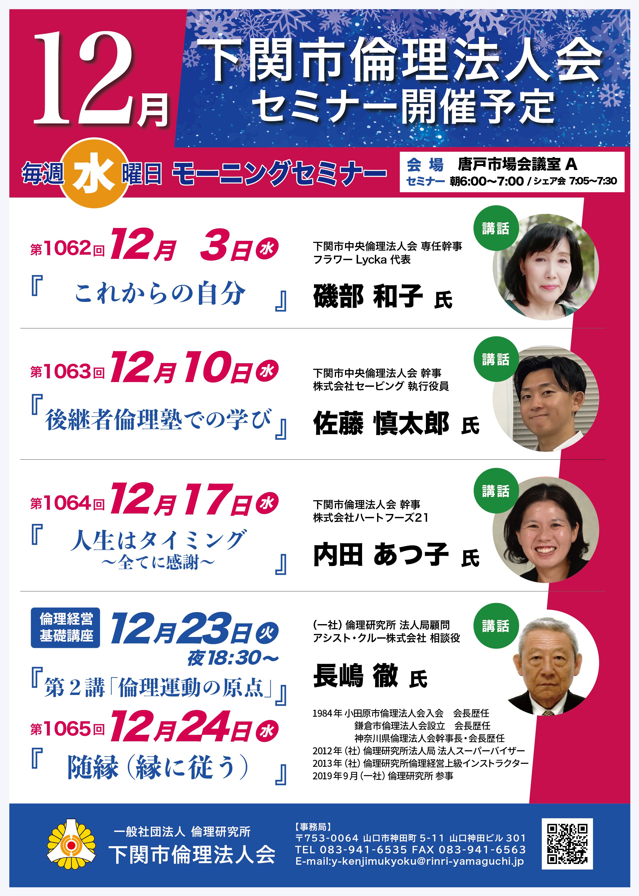 2025年12月3日(水) Mセミナー第1062回 MS 講師:磯部 和子 氏(下関市中央倫理法人会 専任幹事 / フラワー Lycka 代表) /テーマ:これからの自分 2025年12月10日(水) ...